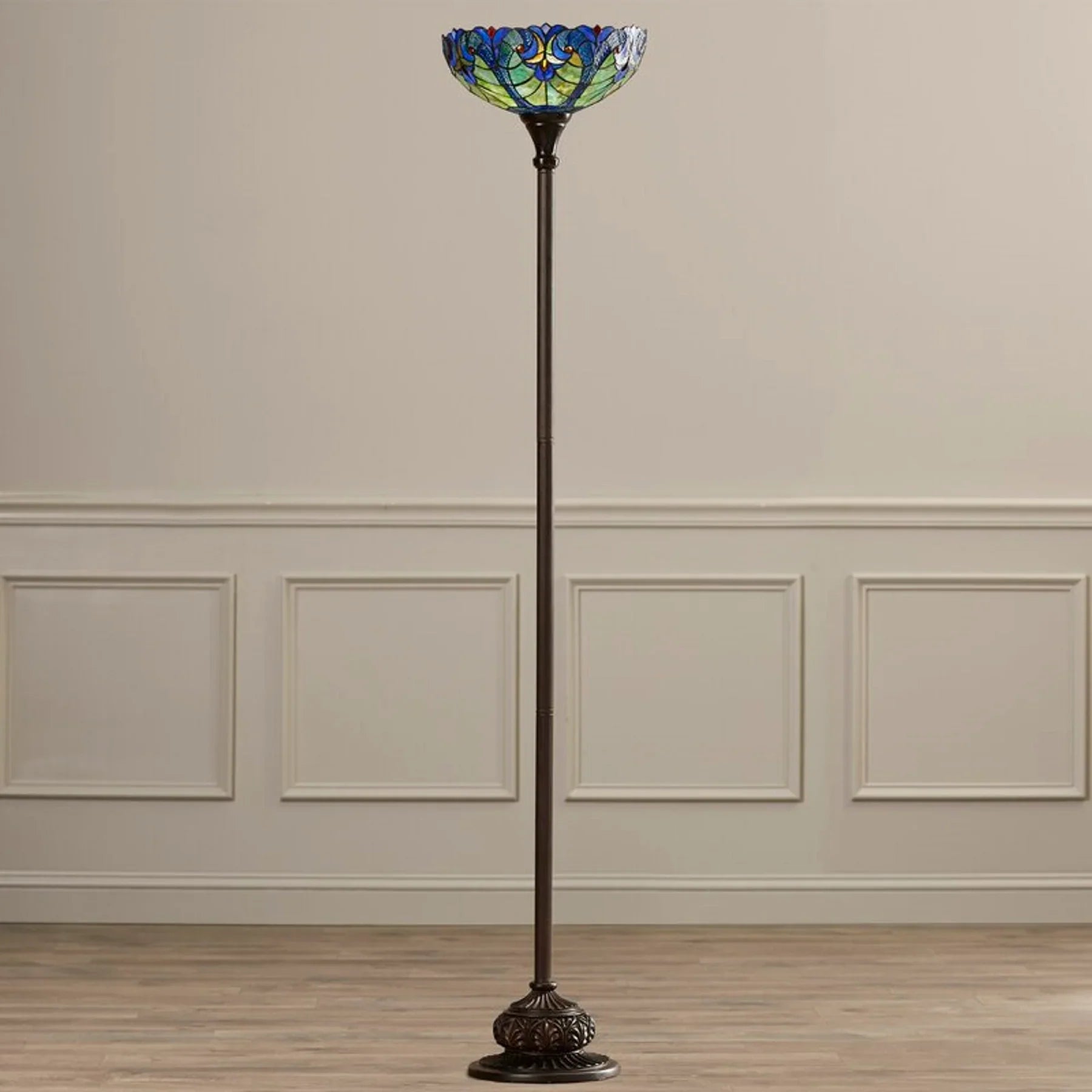 Bring timeless elegance to your living space with this exquisite Tiffany-style stained glass floor lamp. Featuring a hand-crafted stained glass shade with vibrant hues of yellow, blue, red, and purple in a classic floral motif, this lamp adds warmth and charm to any room. The sturdy bronze-finished base and tall, slender pole offer both stability and style, making it a perfect accent for your living room, study, or reading nook.