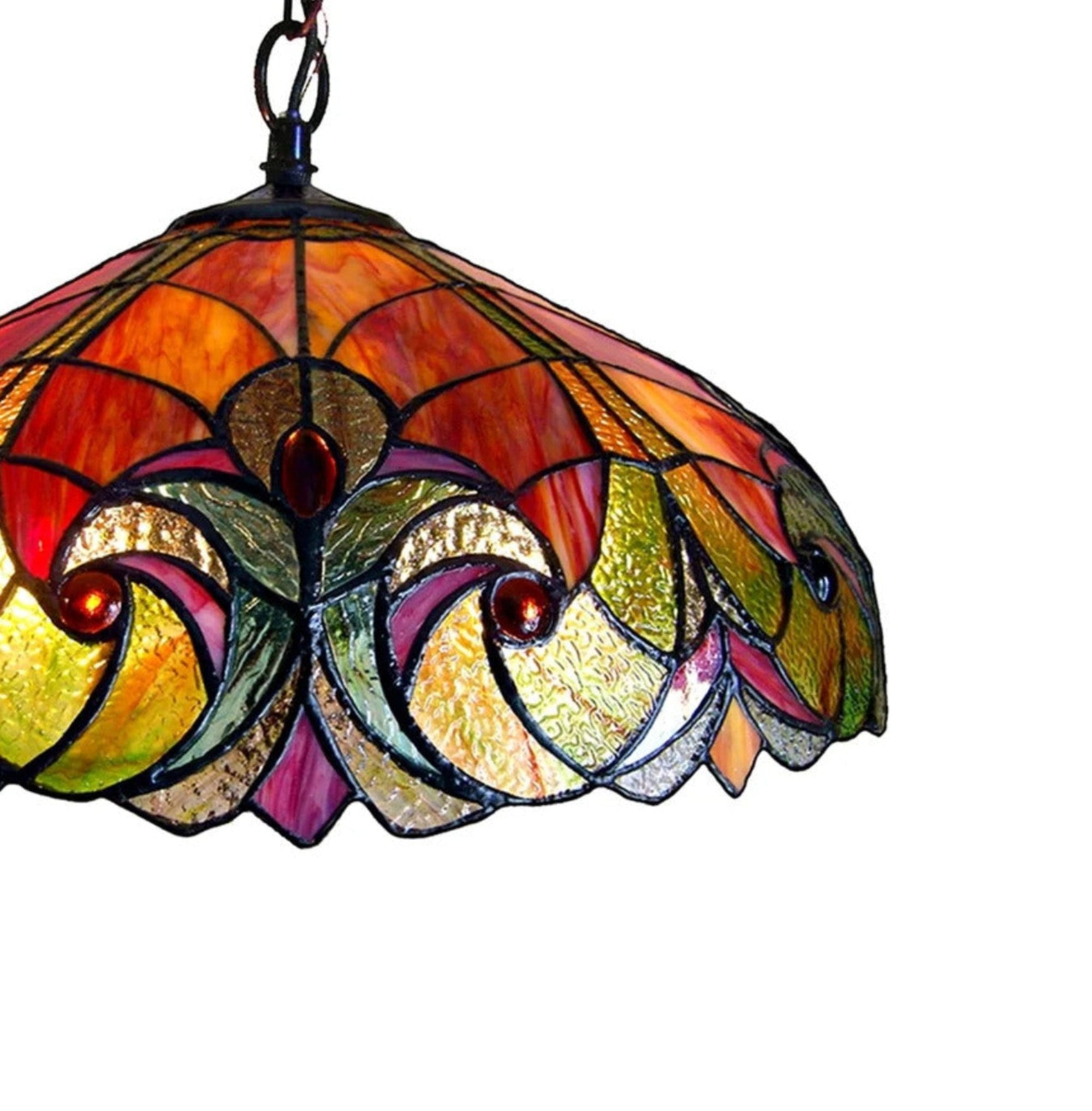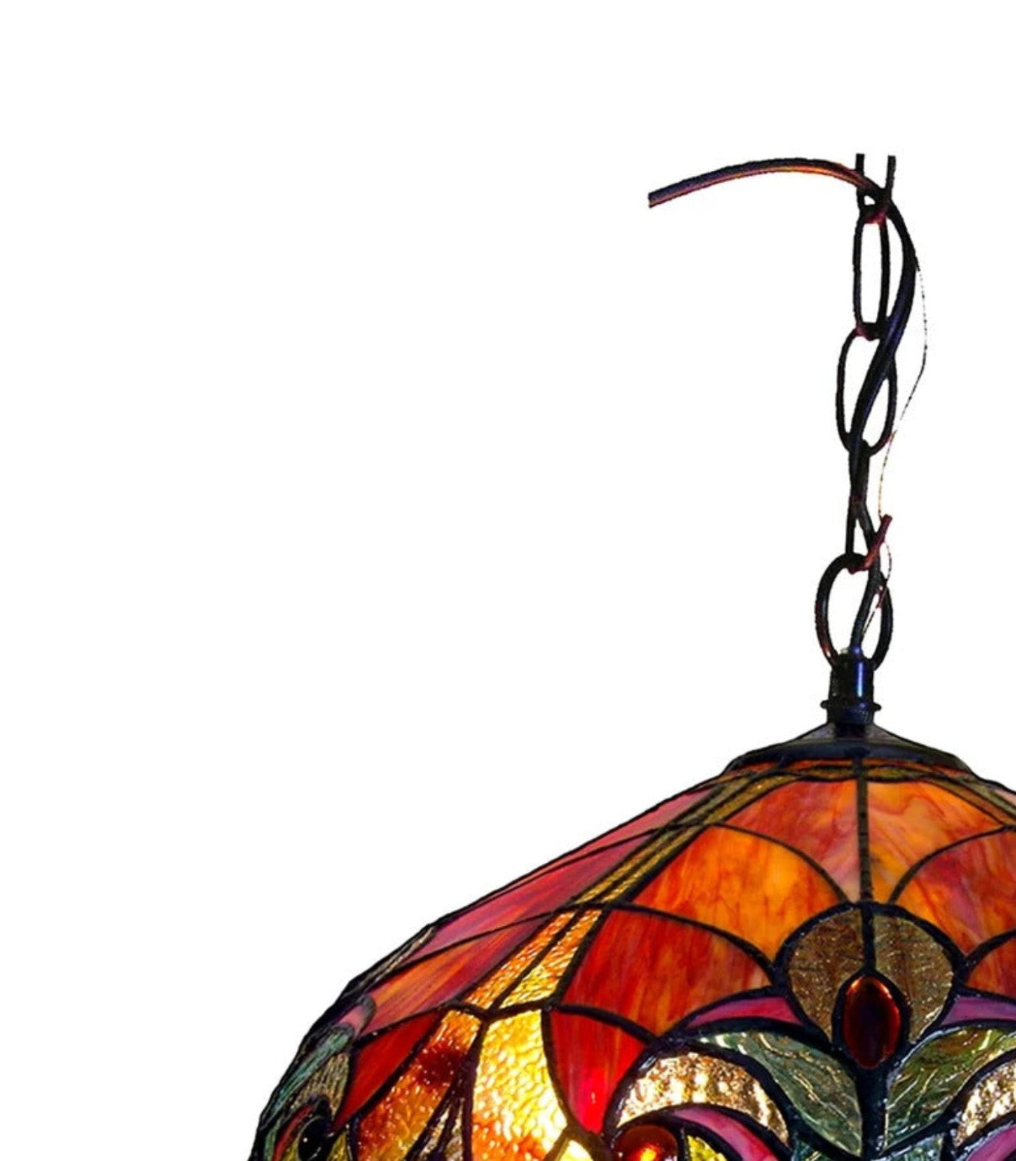 The Liaison ceiling pendant blends classic Victorian charm with artisanal craftsmanship to create a timeless centerpiece for your interior décor. Featuring warm stained-glass tones, gem-like accents, and intricate motifs, this handcrafted Tiffany-style pendant casts a soft, inviting glow while making a graceful design statement. Ideal for dining rooms, foyers, or intimate sitting areas.