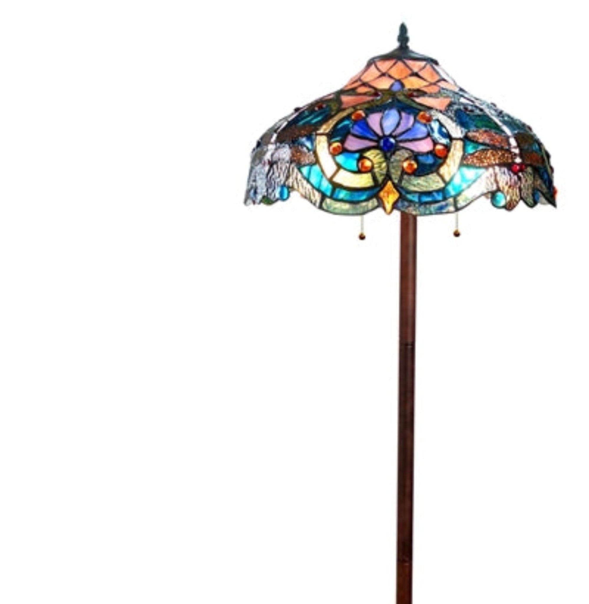 - Elegant Victorian-style floor lamp with rich, gem-toned Tiffany glass
