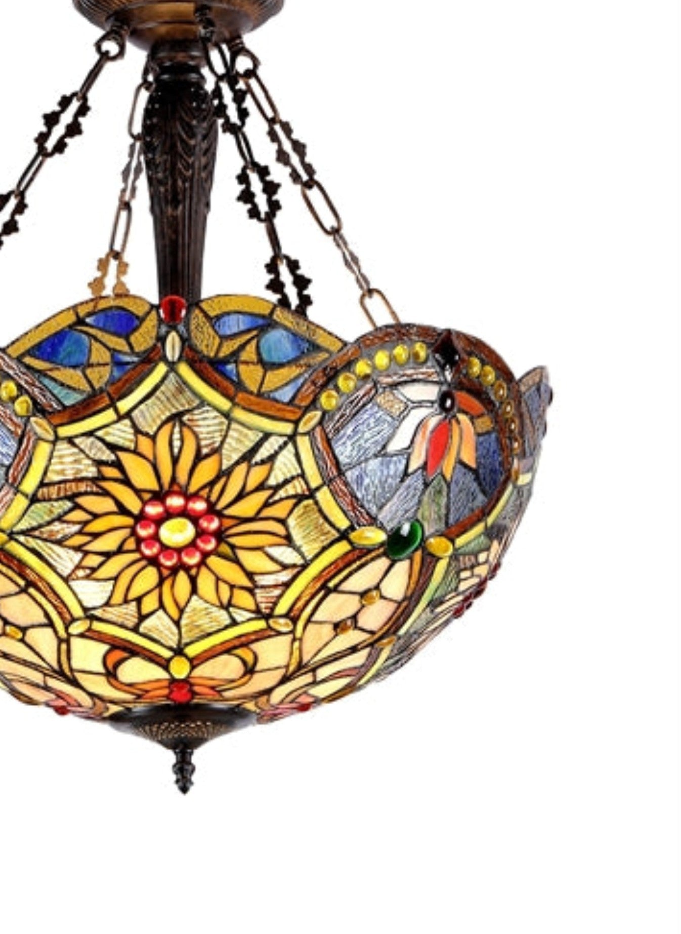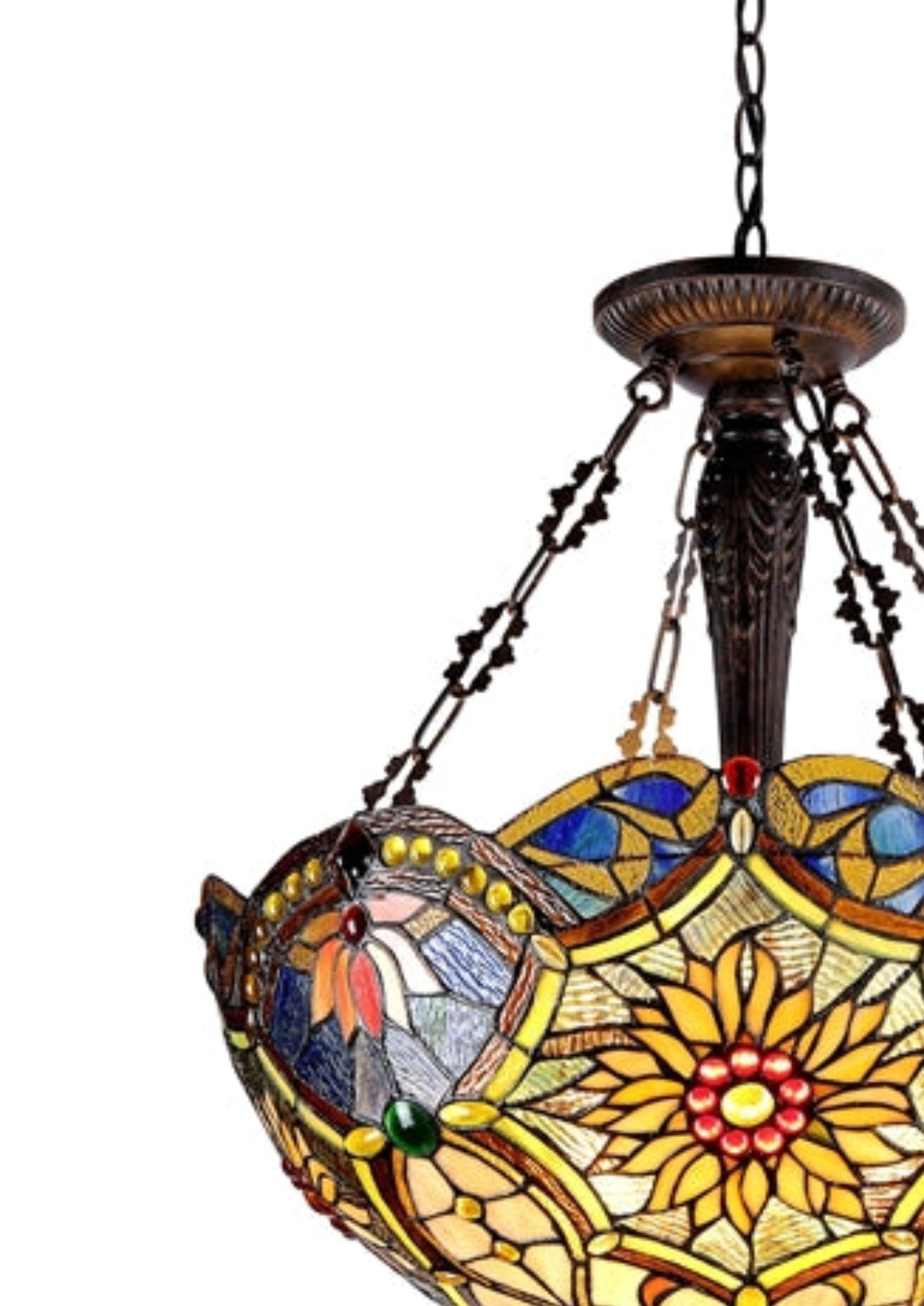 Bring timeless Victorian elegance to your ceiling with the Rebecca Tiffany-Style Pendant. This inverted 3-light fixture features a lavish, handcrafted shade composed of 796 individual glass cuts and 148 glass beads, all arranged in rich hues under the signature Tiffany copper-foil technique. The dark antique bronze hardware complements the vintage aesthetic, making this pendant a showpiece above dining tables, foyers, or living areas.