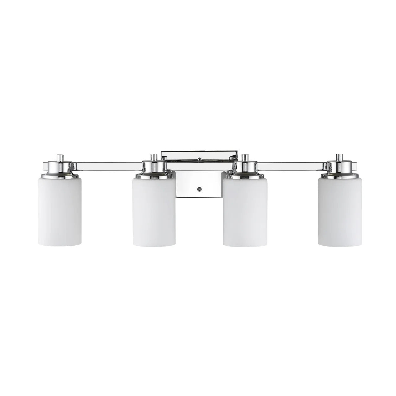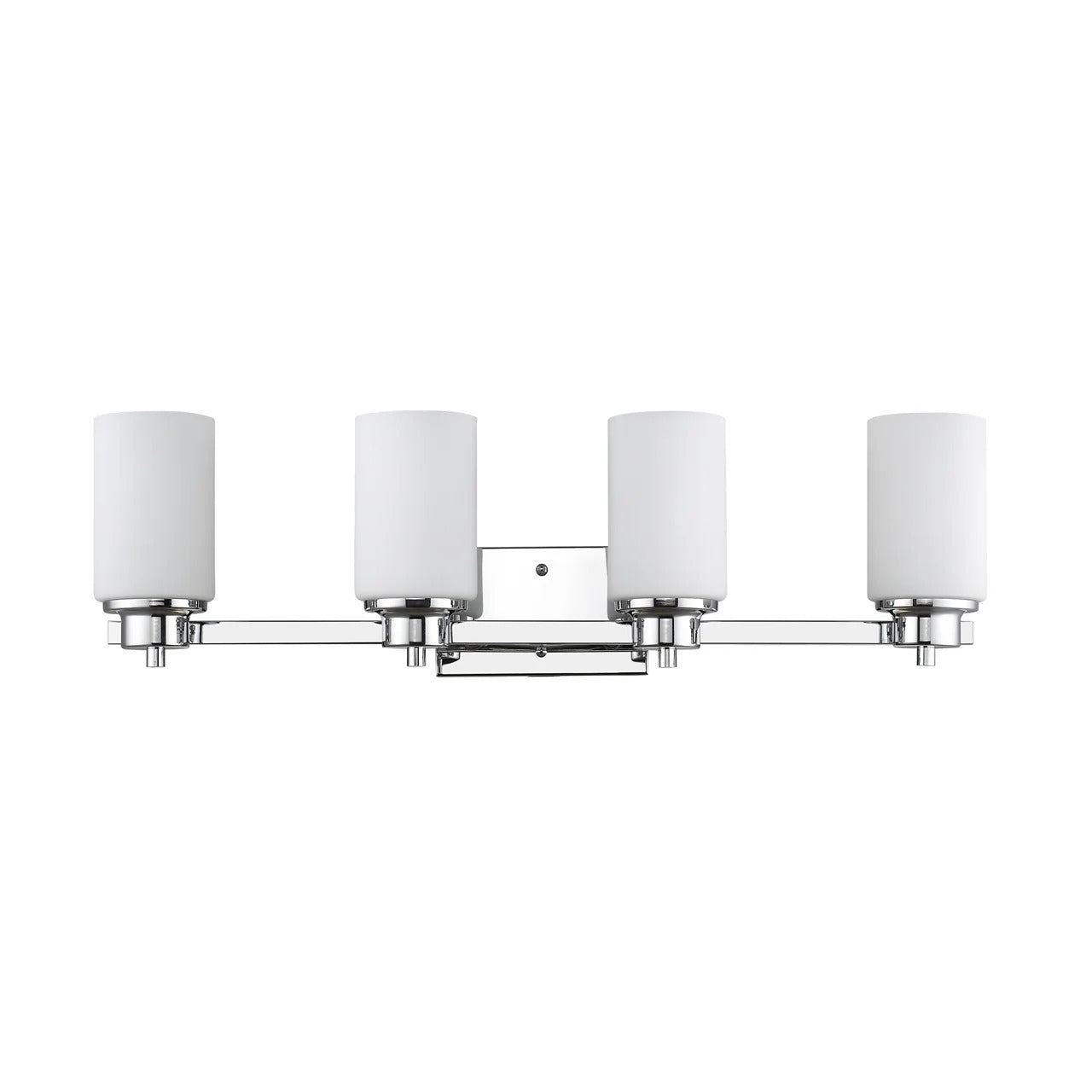 Bring sophisticated elegance to your bathroom with the Scarlett 4-Light Vanity Fixture. Featuring a lustrous chrome finish and etched white glass cylinder shades, this contemporary bath light delivers balanced brightness with a soft, diffused glow. Its sleek steel frame with clean lines blends beautifully into transitional and modern interiors.