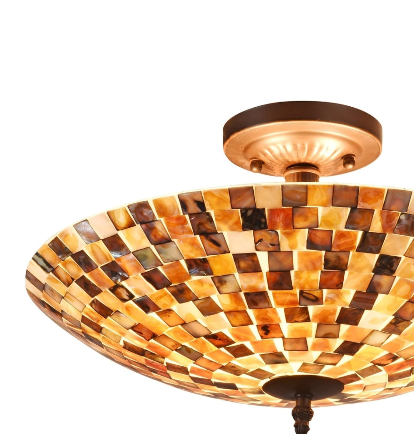 Elevate your space with the radiant charm of the Shelley Mosaic Semi-Flush Ceiling Fixture, a handcrafted piece that blends natural beauty with artisan craftsmanship. Featuring a dazzling shade composed of over 530 pieces of seashell and art glass, this fixture casts a soft, warm glow in tones of brown, black, and orange. The dark bronze finish base complements its rich, earthy palette, creating a standout piece for any indoor setting. Its semi-flush design is ideal for rooms with lower ceilings, offering style without sacrificing space.