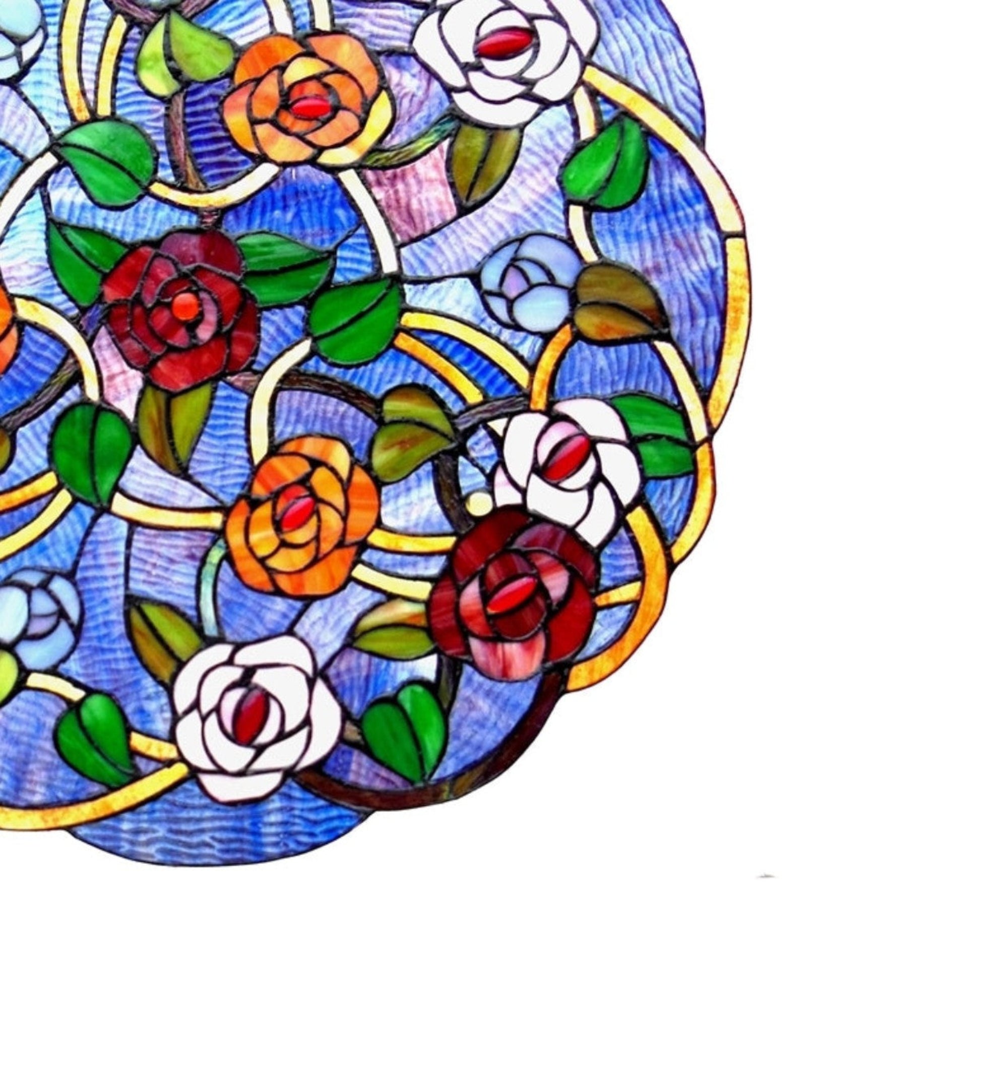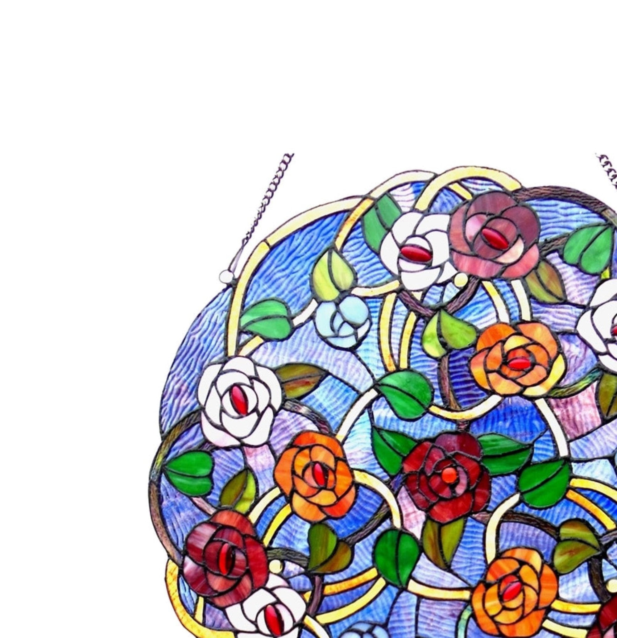 Add romantic charm to your window with the SHREVEPORT Tiffany-style window panel, a radiant composition of blooming roses in vivid hues of red, blue, green, orange, and white. This stunning 24-inch round piece is handcrafted from 400 pieces of copper-foiled stained glass and 16 decorative beads, all assembled using time-honored Tiffany techniques. Whether hung in a sunlit window or displayed as wall art, it’s a breathtaking accent that brings timeless beauty to any space.