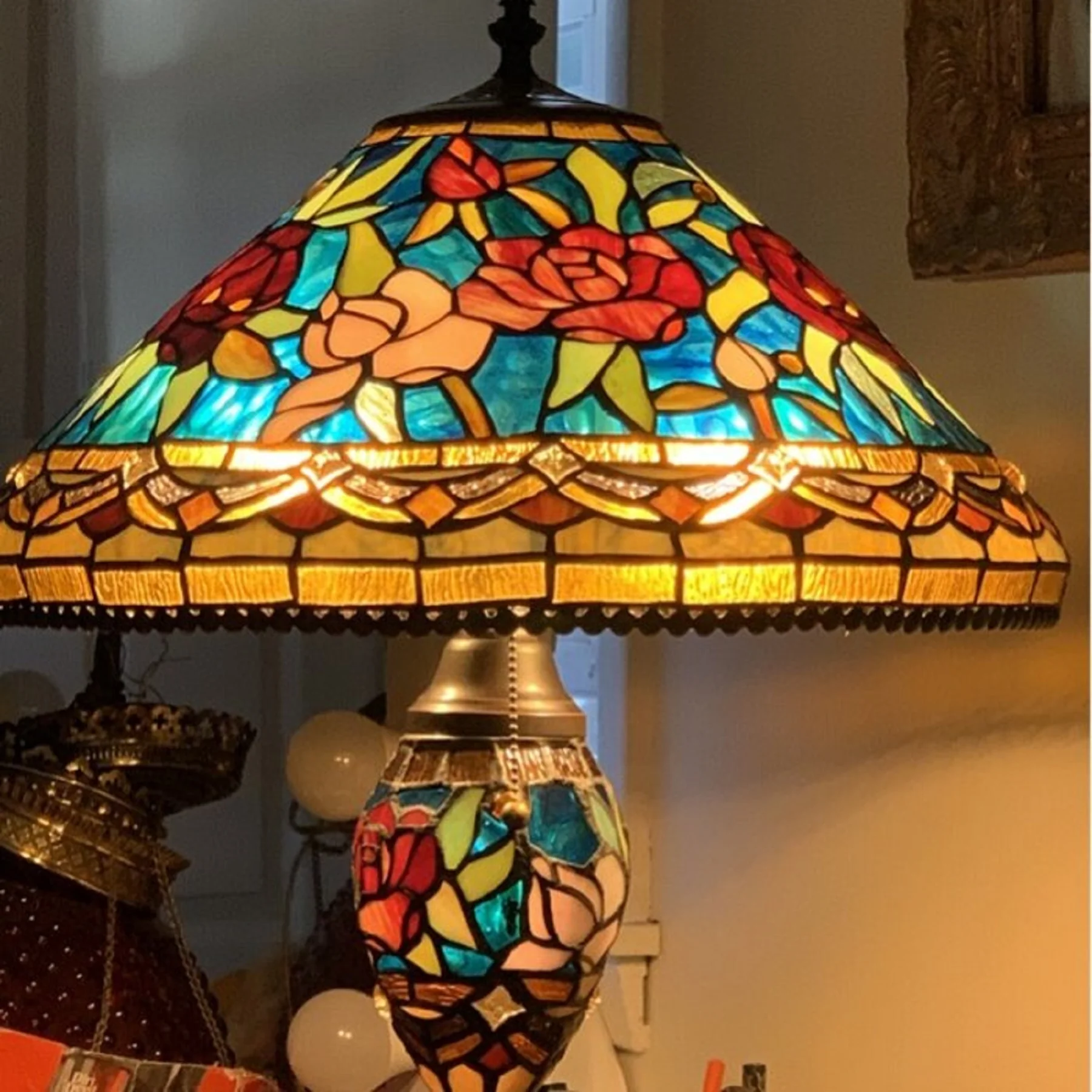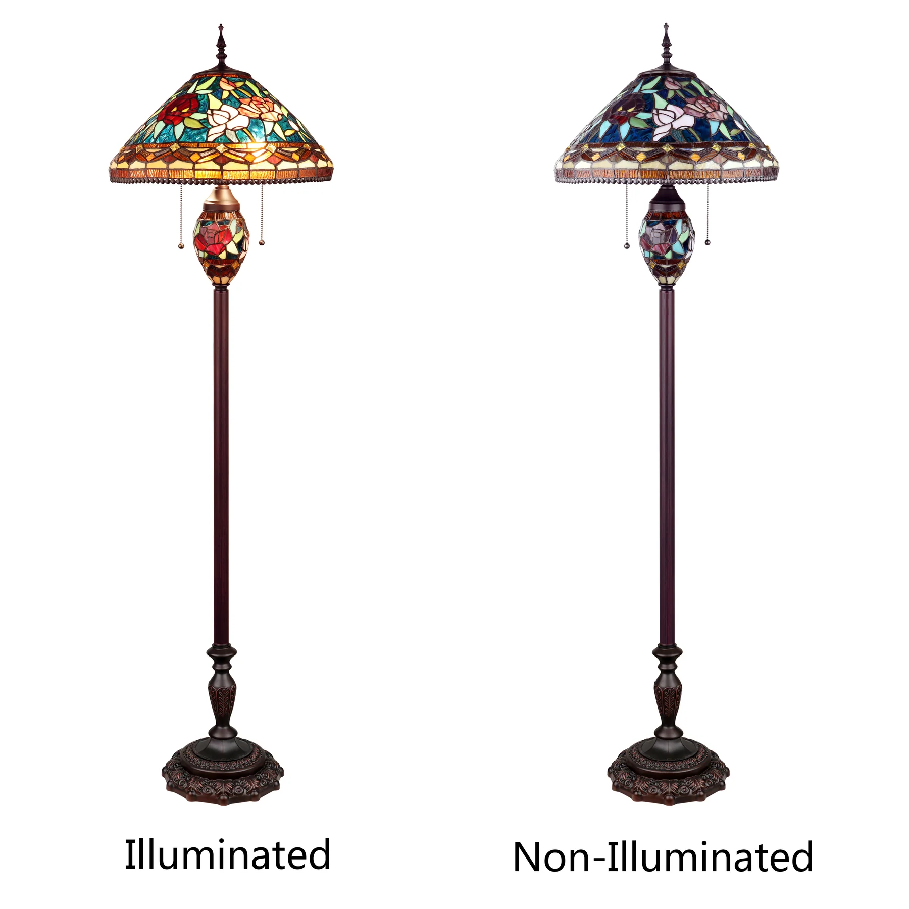 Infuse your space with romantic charm and warm light using the SINCERE Tiffany-style floor lamp. Featuring a gorgeous rose motif, this double-lit fixture is handcrafted from 702 pieces of real stained glass and 60 decorative beads, all copper-foiled using techniques pioneered by Louis Comfort Tiffany. The deep gem tones and softly pedestaled glass offer both brilliance and subtlety. The unique double lighting allows you to use just the mid-section for a cozy, ambient glow or all lights for full-room brightness.