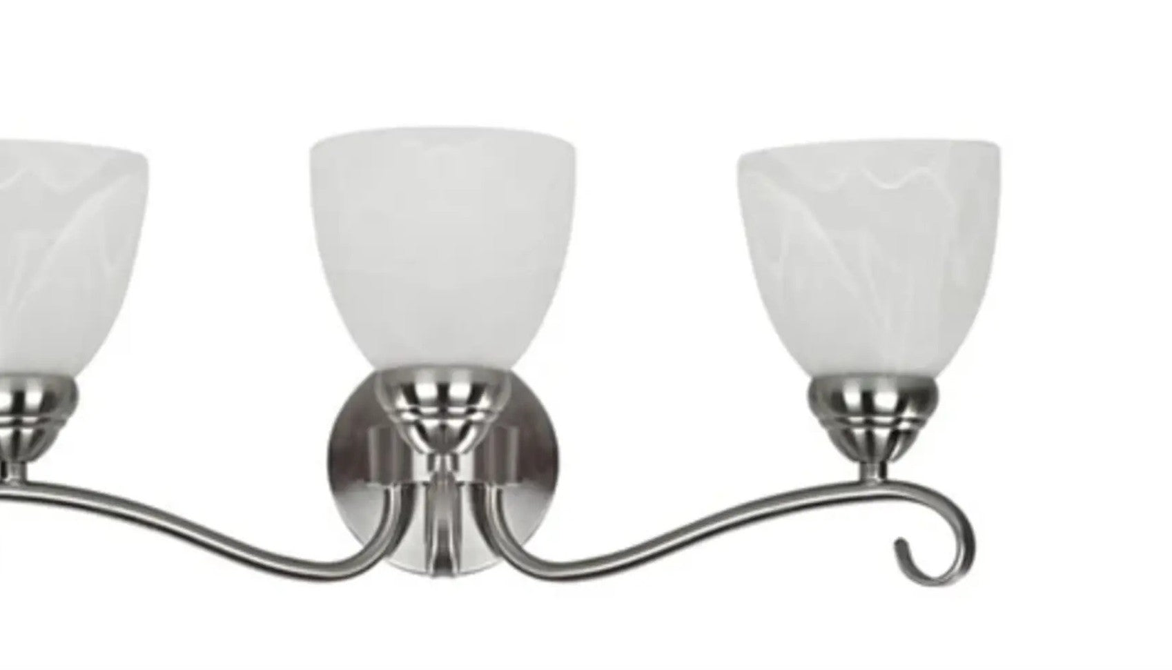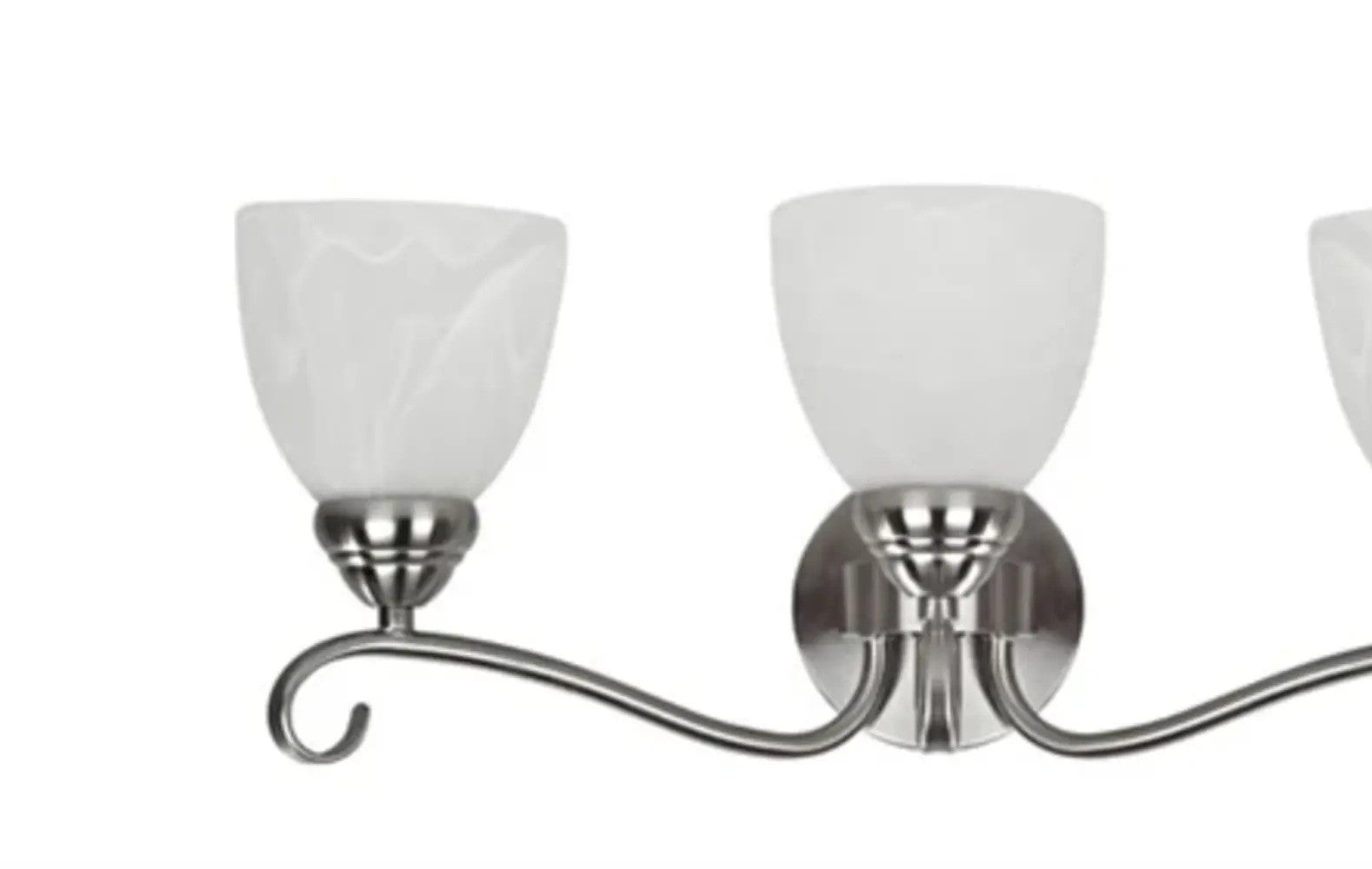 Brushed nickel finish with white alabaster glass shades for a classic touch