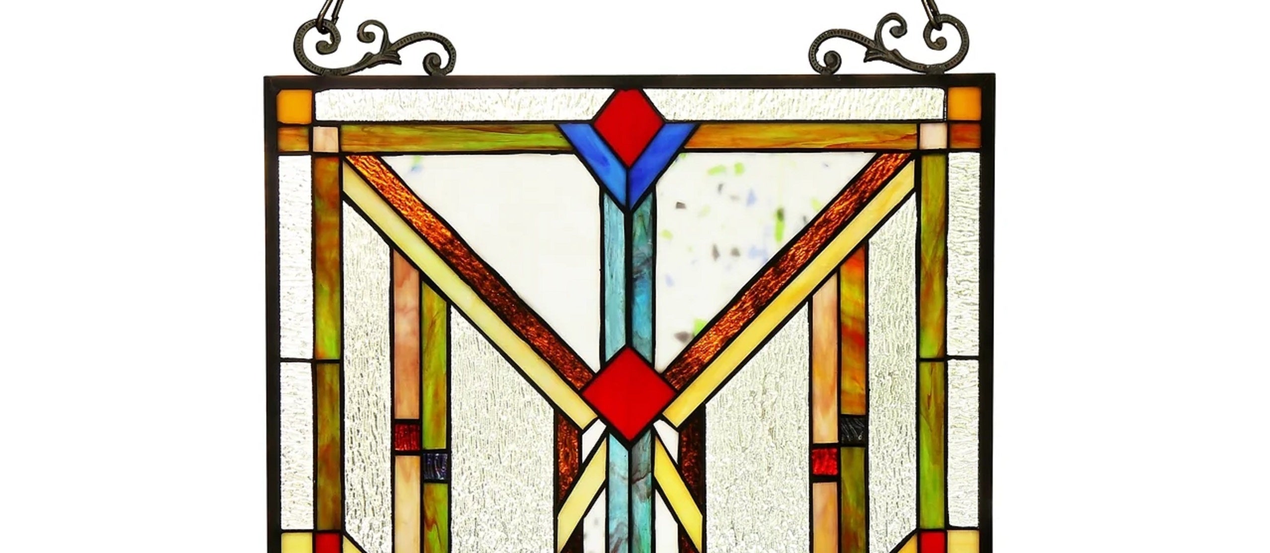 The Chloe Lighting Vanderleck Tiffany-Glass Window Panel (17.5" x 25") is a handcrafted stained glass panel designed to enhance your indoor spaces with vibrant colors and intricate patterns. This panel features 132 individually cut glass pieces and comes with a hanging chain for easy installation. Please note that due to its handcrafted nature, the exact color and pattern may vary slightly from the images .