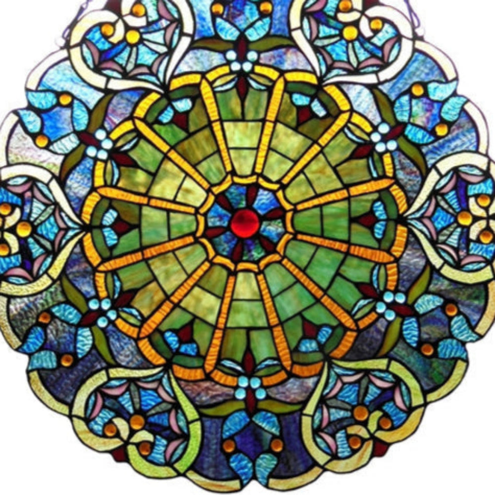 The Chloe Lighting CH1P145VB23-GPN "Willa" Tiffany-Glass Victorian Window Panel is a handcrafted stained glass piece featuring a vibrant Victorian design. It is composed of 561 hand-cut glass pieces and 55 beads, set in a round shape with an antique bronze-finished metal frame. The panel includes a hanging chain for easy installation and is designed for indoor use.