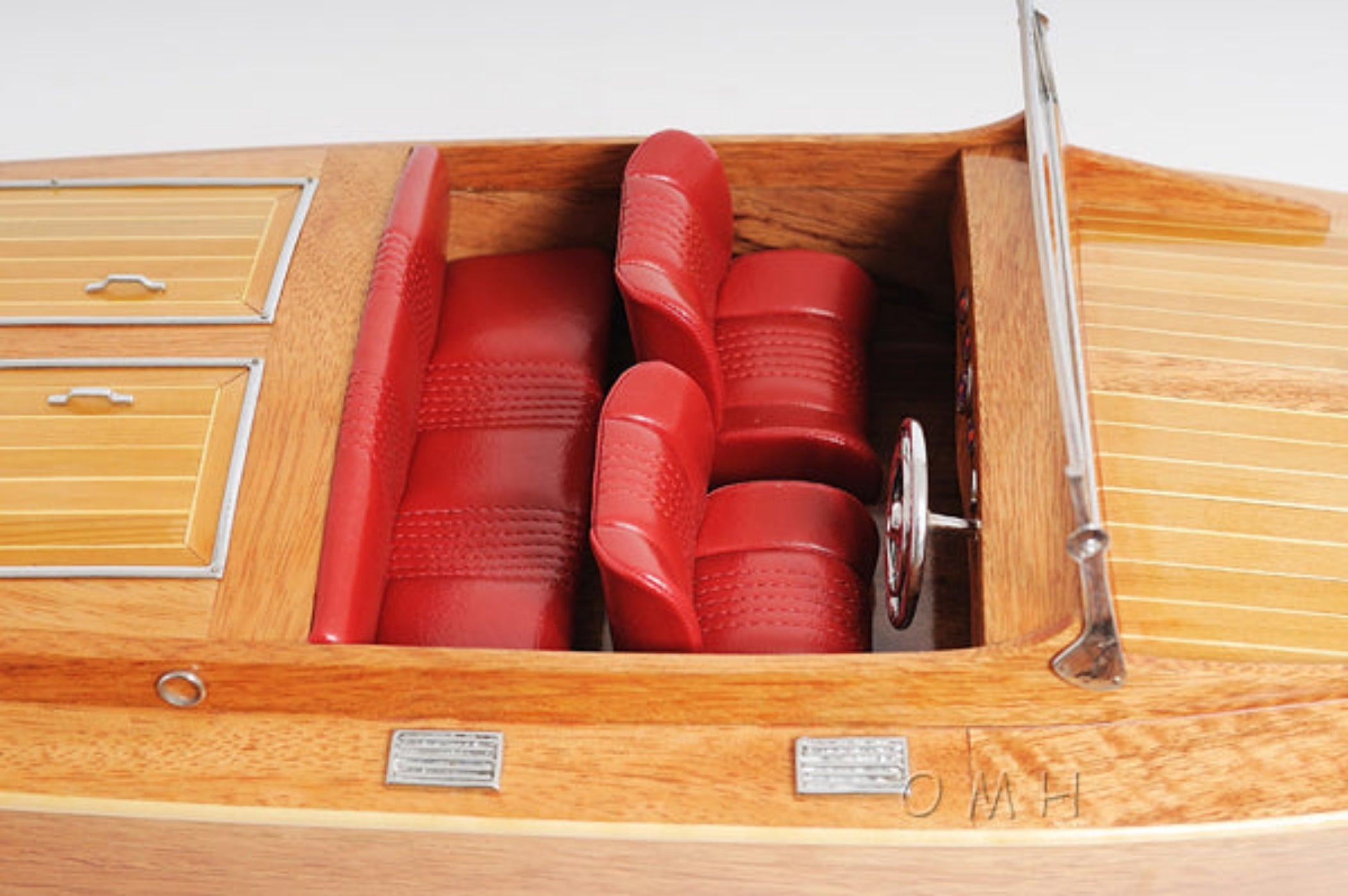 Experience the elegance of classic nautical design with the Chris Craft Runabout model. Handcrafted from mahogany and western red cedar, the hull is built using plank-on-frame construction. Each wood strip is carefully joined by skilled artisans, creating a realistic miniature boat. The model features authentic brass fittings, including windshield frame, steering wheel, gauges, lights, propeller, and flagpole. The leather seating is meticulously stitched for a lifelike appearance. A detachable wooden stand is included for easy display. This model celebrates the rich history of Chris Craft boats, founded by Christopher Columbus Smith in the 1920s, a legendary name in high-powered luxury boating.
