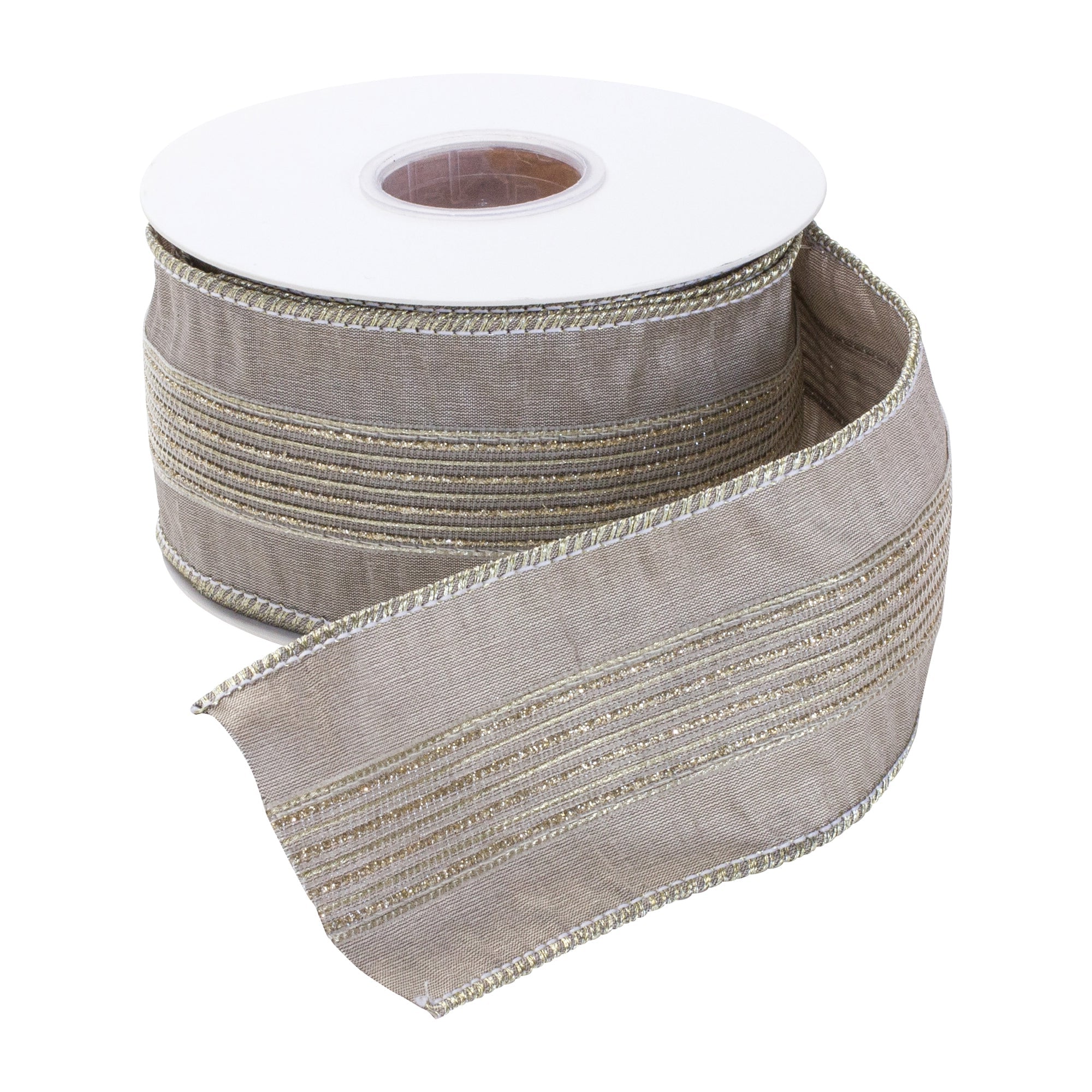 This polyester ribbon features a grey striped design suited for seasonal decorating and craft projects. The wired edges provide structure for shaping bows, accents, and decorative displays that hold their form. Measuring 2.5 inches wide, 360 inches long, and 0.25 inches high, it offers extended length for gift wrap, wreaths, garlands, and home decor applications. The polyester construction delivers durability and flexibility while supporting repeated use. Ideal for indoor and covered outdoor spaces, this ribbon is designed to complement a variety of traditional holiday themes. Its neutral color and structured form make it a practical option for enhancing creative projects throughout the season.