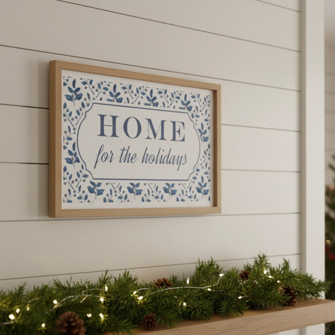 - Framed wall sign with “Home for the Holidays” sentiment