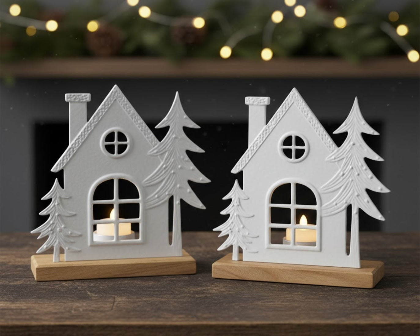 Add a warm, festive glow to your décor with this Metal House Tealight Candle Holder Set. Crafted from aluminum with a clean white finish and accented by a natural wood base, each house features window cutouts designed to softly diffuse candlelight. Ideal for tabletops, mantels, or shelves, this set brings cozy winter charm to seasonal and everyday displays.