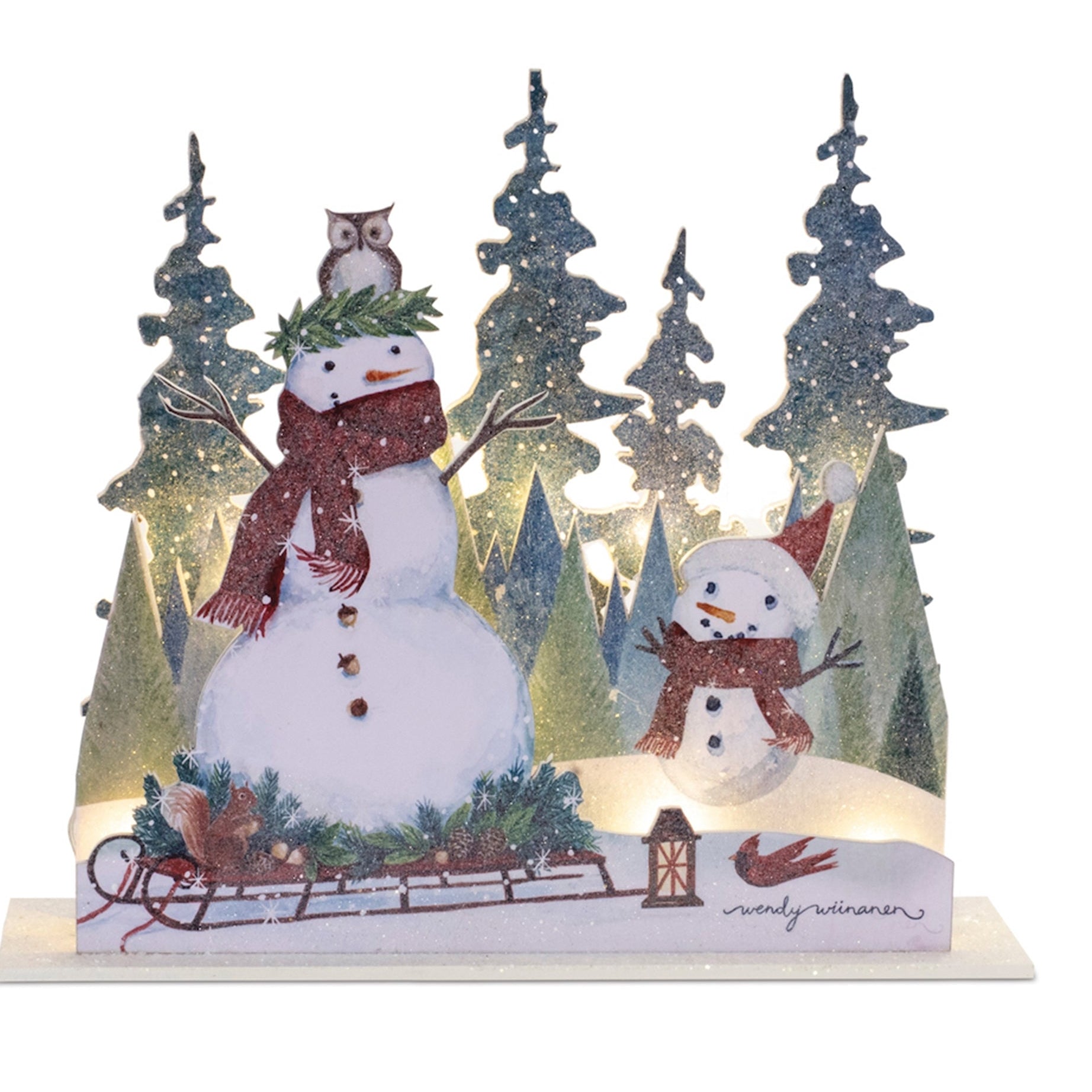 Bring cozy Christmas charm into your home with the Christmas LED Snowman Scene by Melrose. This whimsical holiday décor piece showcases two cheerful snowmen bundled in scarves, a playful owl perched atop a snowy scene, and softly glittered evergreen trees in the background. Crafted from sturdy MDF and beautifully illustrated by artist Wendy Wiinanen, this layered winter display is illuminated with warm LED lighting that creates a gentle, inviting glow. Perfect for mantels, shelves, or entryway tables, this charming Christmas accent also features a built-in 6-hour timer for effortless seasonal ambiance.