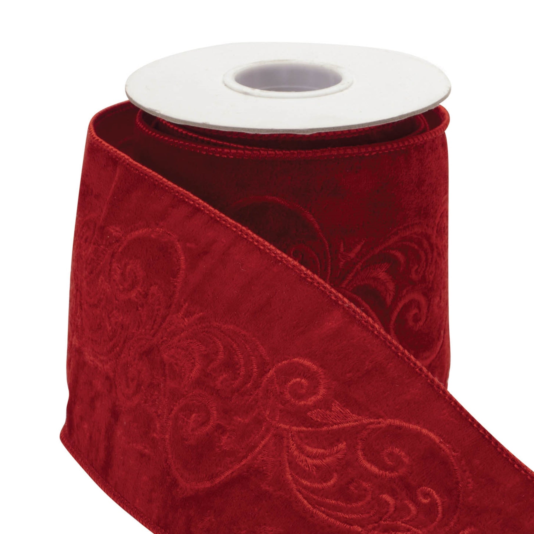 This Christmas ornate embroidered wired ribbon adds structure and festive detail to seasonal decorating projects. Crafted from soft polyester with iron wiring along the edges, it features intricate embroidery in a bold red tone for a refined holiday look. The wired edge allows easy shaping and holds bows, wraps, and accents in place. Ideal for gift wrapping, wreaths, garlands, floral arrangements, and craft projects, this ribbon offers versatile indoor use throughout the holiday season. Designed for decorative applications, it brings polish and durability to creative displays. Measures 180" L x 4" W x 0.25" H.