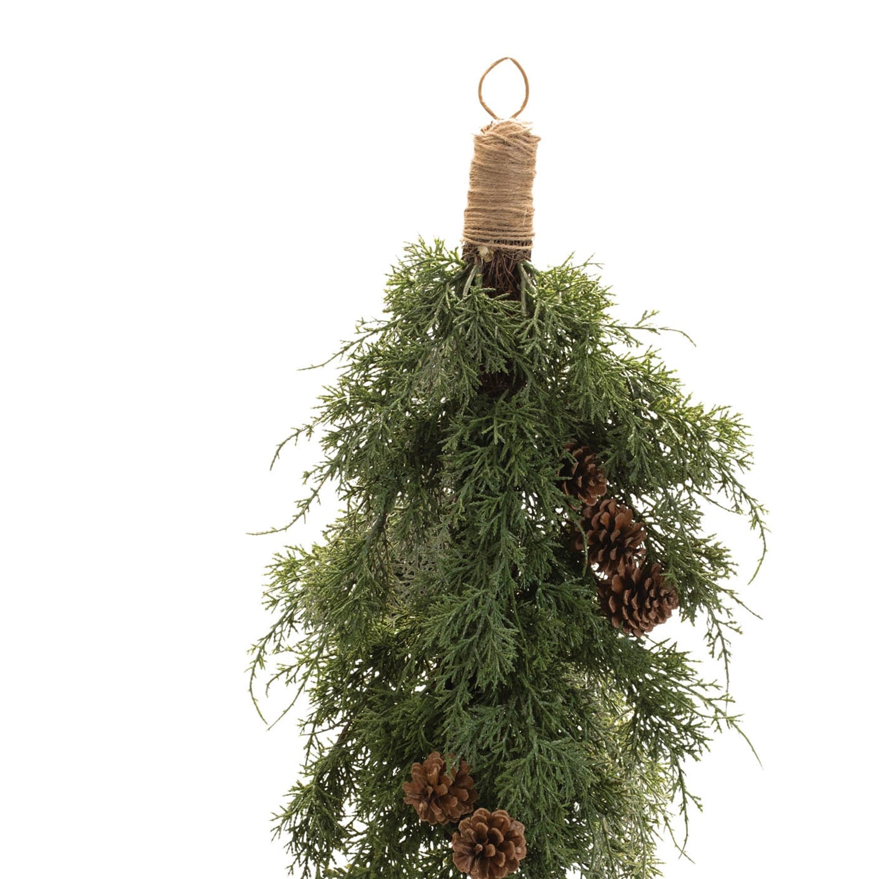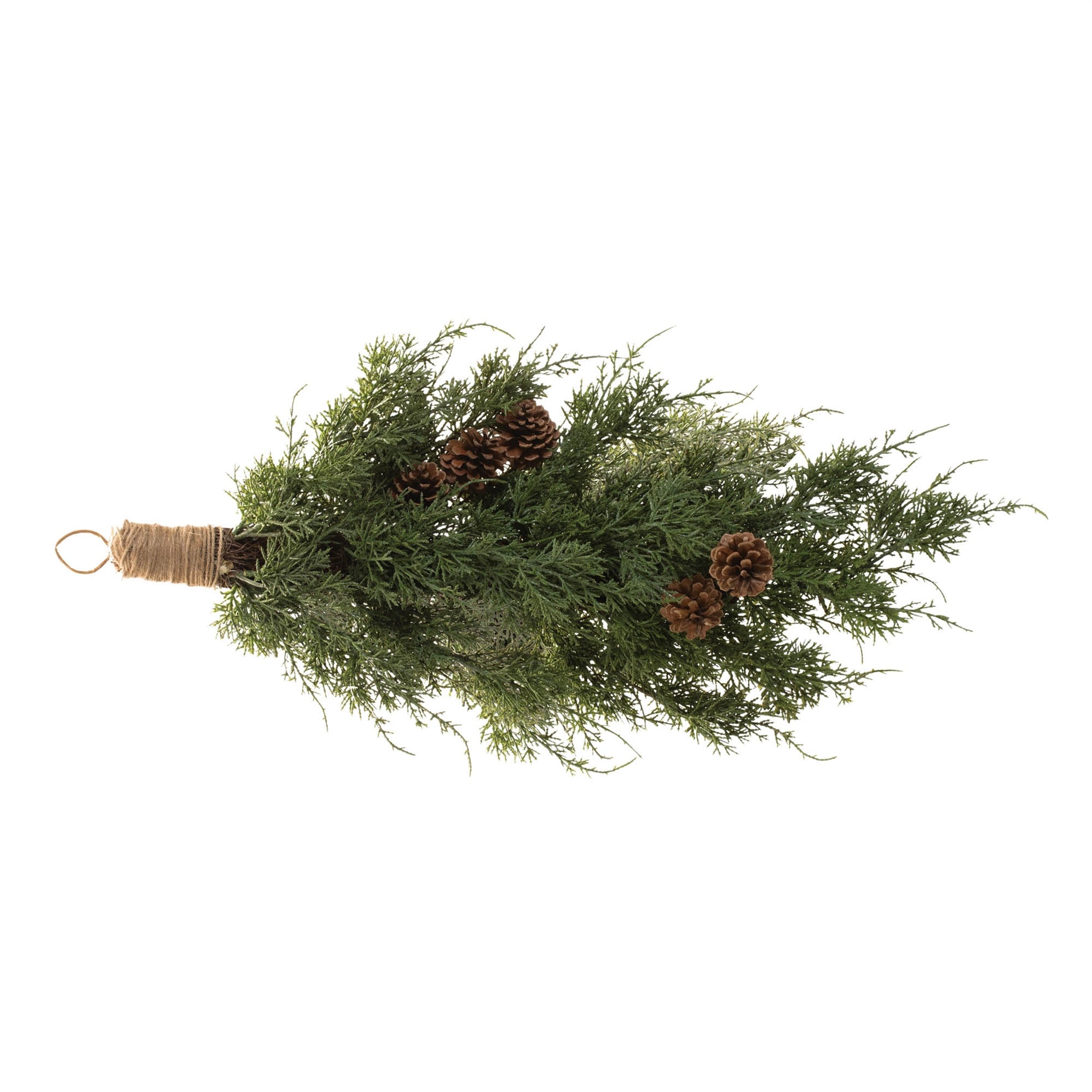 The Christmas pine wall swag adds natural seasonal style to indoor holiday decorating. Crafted from PE plastic with iron construction, this decorative swag features layered pine foliage in green and brown tones accented with natural pinecones for a rustic finish. A jute bundled hanger provides easy hanging and enhances the farmhouse-inspired look. Ideal for doors, walls, mantels, or near the Christmas tree, this swag brings warmth and texture to traditional holiday settings. Designed for indoor use only, it offers long-lasting beauty without maintenance. Measures 18" L x 6" W x 28" H, making it a versatile accent for seasonal displays throughout your home.