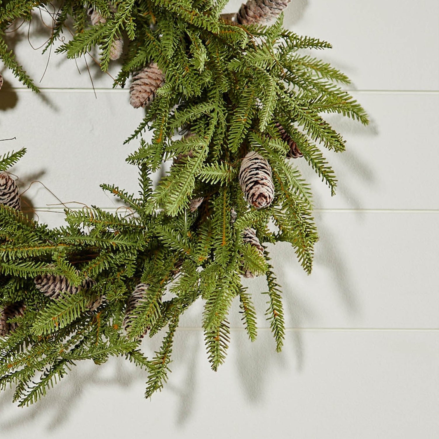 This Christmas pine and pinecone wreath adds a warm, seasonal accent to doors, walls, and mantels. Crafted from durable PE plastic with iron support and a natural twig base, it features layered pine foliage accented with frosted pinecones in rich green and brown tones. Wired branches allow easy shaping for a full and balanced display. Designed for indoor use, this wreath complements traditional and rustic Christmas décor styles. Hang it on a front door, above a fireplace, or near a Christmas tree to create a welcoming holiday atmosphere. Measures 24" L x 7" W x 24" H when fully shaped.