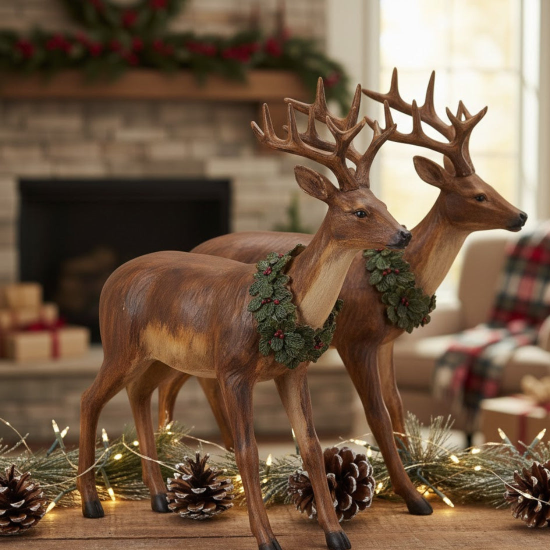 Add a charming woodland accent to your seasonal décor with this Deer with Wreath Figurine Set. Crafted from durable resin, each deer features lifelike detailing in earthy brown tones, complemented by a festive green holly wreath for a classic holiday touch. Designed as a matching set of two, these decorative accents are perfect for styling together on a mantel, tabletop, shelf, or entryway console. Their timeless design pairs beautifully with Christmas trees, Santa figurines, or seasonal floral arrangements, bringing warmth and elegance to your holiday display.