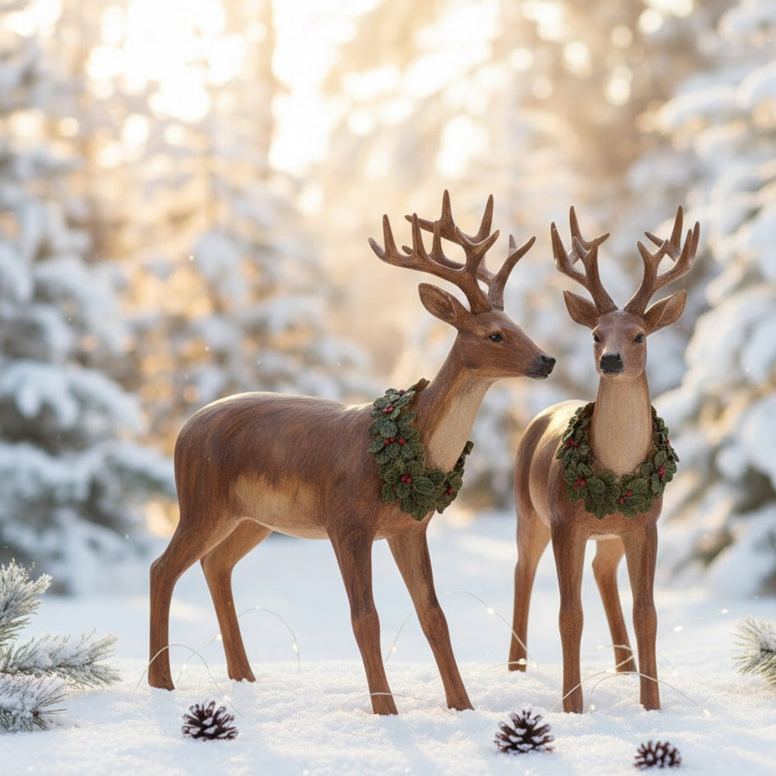 - Features deer figurines with festive wreath accents