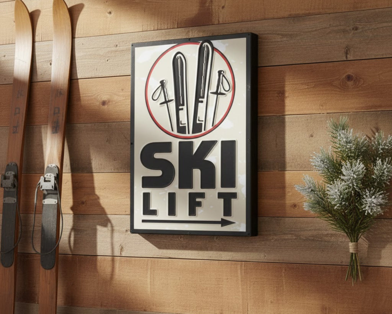 This Christmas ski lift wall sign brings a lodge-inspired accent to seasonal décor. Made from MDF and tin, the piece measures 10.75 inches wide and 15.75 inches high, offering a lightweight yet sturdy construction suitable for various wall spaces. The cream and black color palette creates a clean, winter-themed look that pairs well with rustic, cabin, or alpine holiday styles. Ideal for entryways, living rooms, or themed displays, the sign adds a simple decorative touch without overpowering existing décor. Its durable materials and versatile size make it a practical option for seasonal use throughout the winter months.