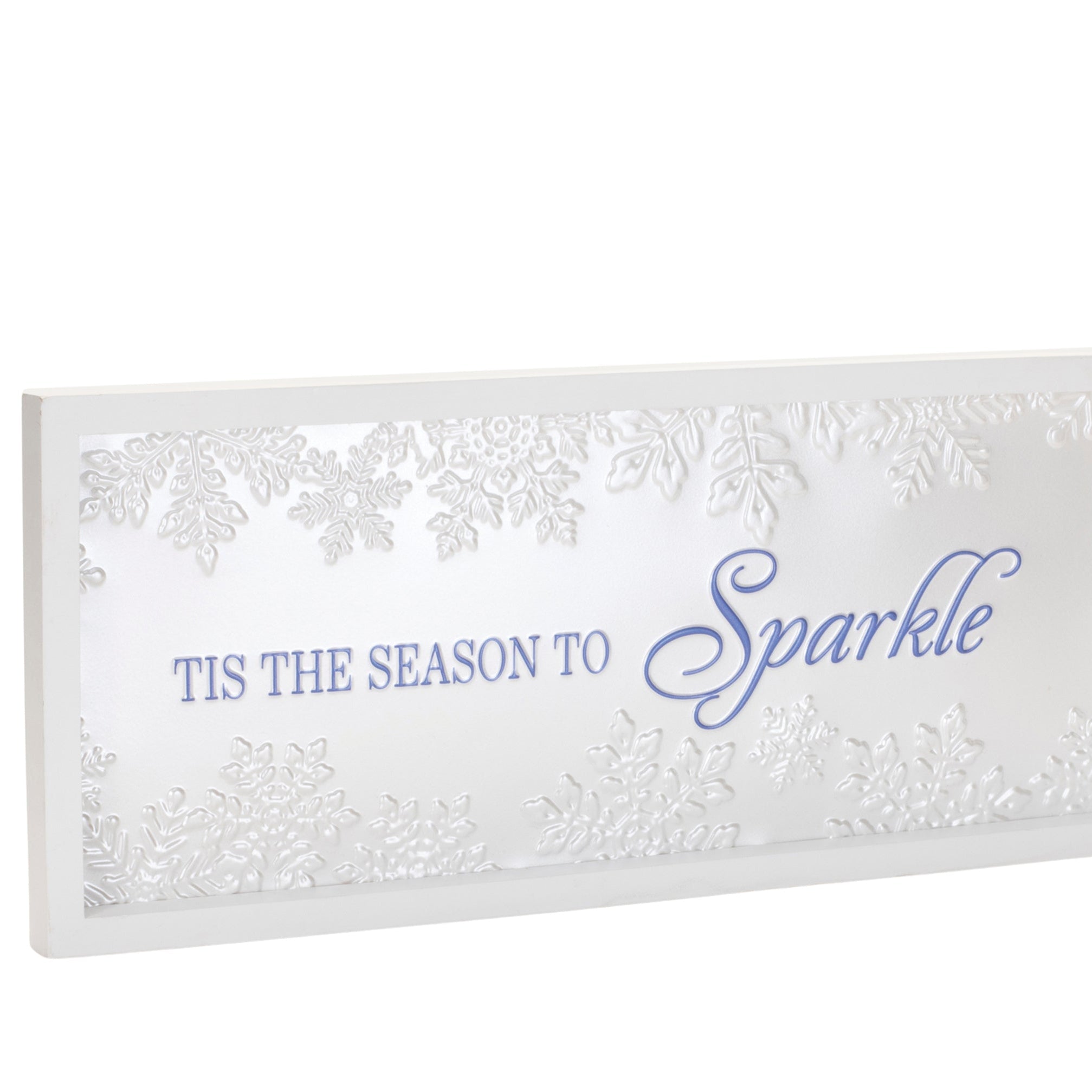Add festive charm to your home with this Christmas “Tis the Season to Sparkle” framed wall decor. Designed in wintry white and blue tones, the cheerful holiday message is accented with delicate snowflake details that bring seasonal elegance to any space. The natural fir wood frame paired with MDF backing creates a sturdy yet stylish look that complements both modern and rustic Christmas decor. Perfect for living rooms, entryways, hallways, or holiday-themed displays, this wall sign easily spreads seasonal cheer. Two sawtooth hooks on the back allow for secure and simple hanging. Measuring 20 inches long, 1 inch wide, and 8.5 inches high, this indoor wall decor makes a beautiful seasonal accent or a thoughtful Christmas gift.