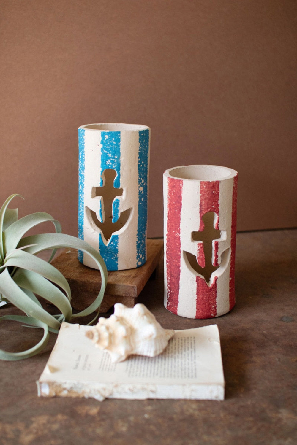 Coastal Anchor Luminaries – Painted Clay Lanterns 8.25" Tall Set of 2 by Kalalou