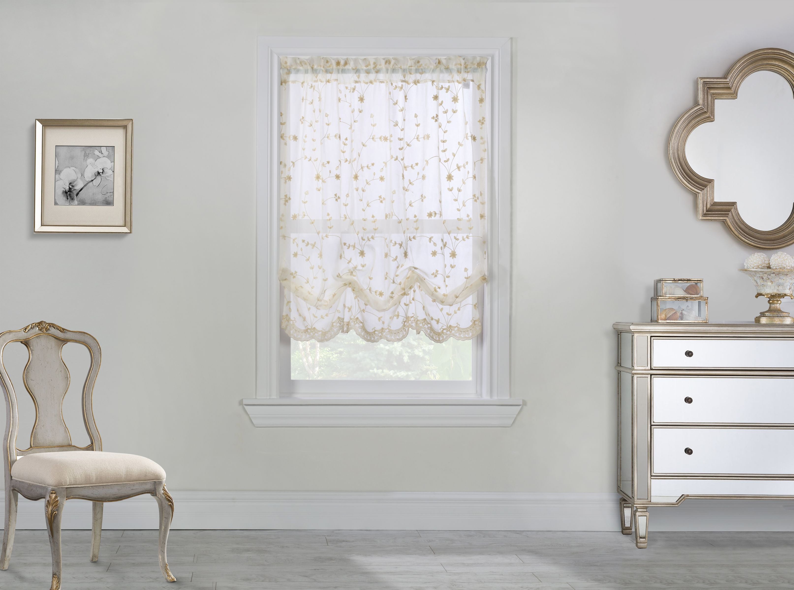 - Designed in a beautiful floral embroidered pattern with an elegantly styled embroidered scalloped bottom hem. It can either be used dramatically on its own or delightfully as an under-treatment. Coordinate with other accessories from the same collection that are sold separately.