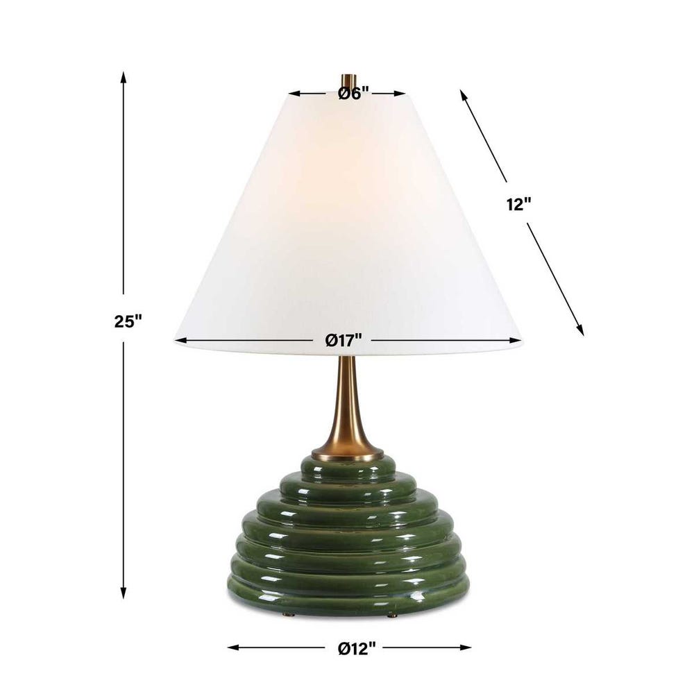 Elevate your home décor with the Uttermost McKay Dark Green Table Lamp by Uttermost, a stunning combination of modern elegance and functional design. This table lamp features a striking dark green ribbed ceramic base that adds texture and visual interest, perfectly paired with sleek brass-plated accents that bring a touch of sophistication and luxury to any room. The coolie hardback shade is covered in crisp white linen, diffusing light evenly to create a warm, inviting ambiance that enhances the mood of your living room, bedroom, or office.Full dimensions of this lamp are 17"W x 17"D x 25"H, making it ideal for side tables, nightstands, desks, or as a decorative statement piece. Its thoughtful design ensures stability and durability, with a wide base and premium ceramic construction that can complement both contemporary and classic interiors. The ribbed texture of the ceramic creates subtle shadows and reflections under light, providing a dynamic visual effect that evolves throughout the day.
