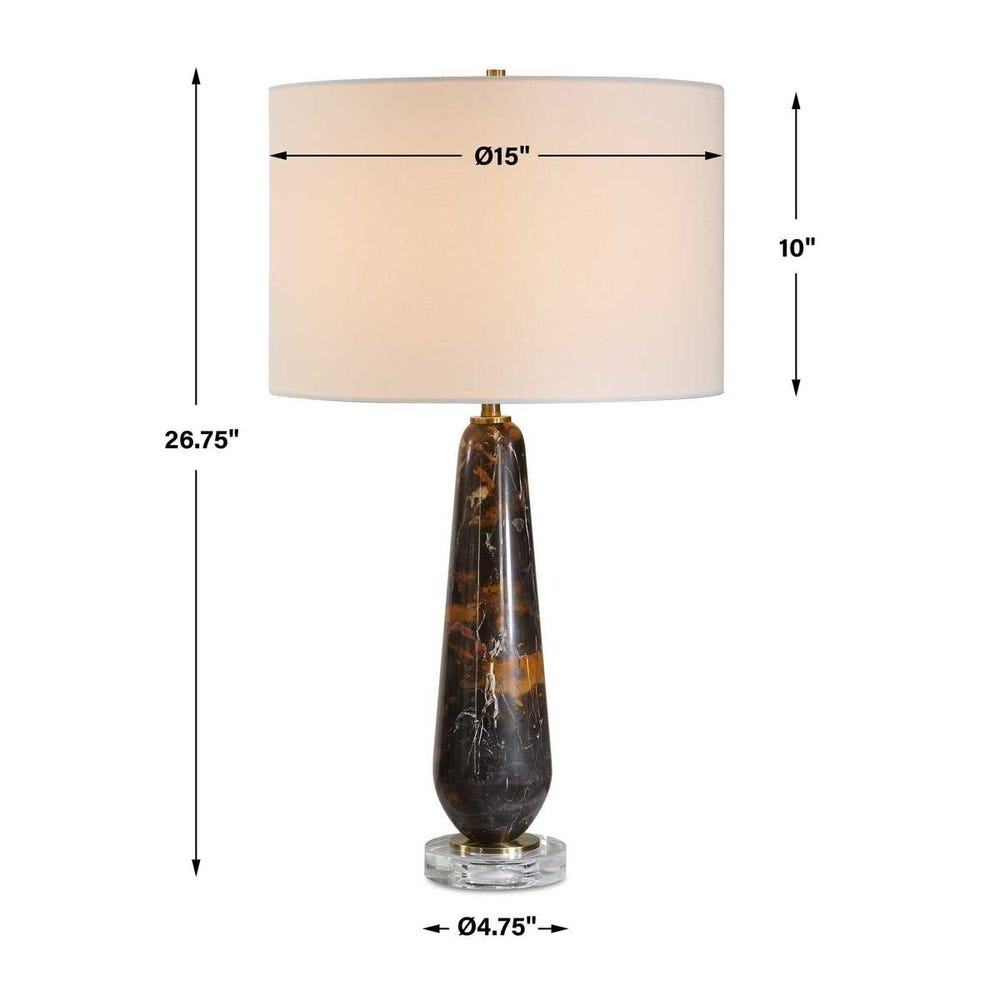 Make a bold, refined statement with this dark marble table lamp, designed to bring natural elegance and visual depth to sophisticated interiors. The solid marble base features striking white and chocolate brown veining, ensuring each piece is naturally one of a kind. Measuring 26.75" H × 15" W × 15" D, this lamp is ideal for living room end tables, bedside styling, or accent consoles where elevated lighting is desired.A thick crystal foot adds clarity and contrast, while antique brass plated accents introduce a warm metallic finish. Completed with a crisp white linen hardback drum shade, this lamp diffuses light beautifully and complements modern, transitional, and luxury-inspired spaces.