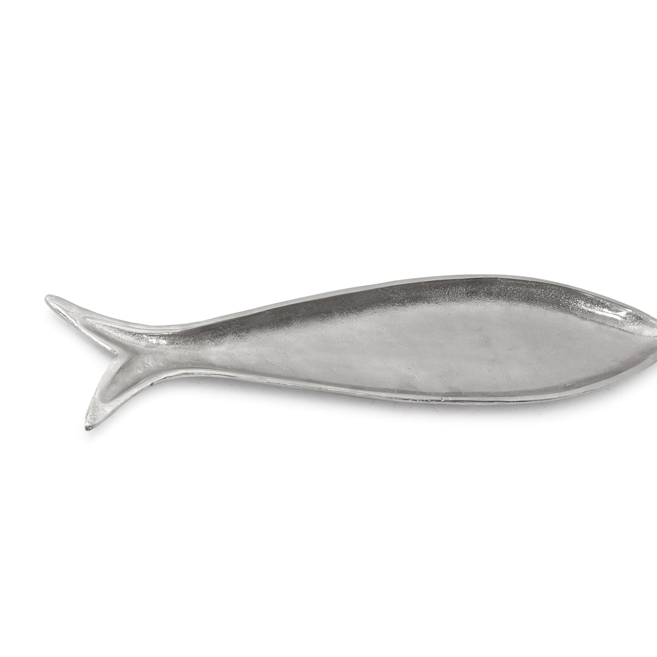 Bring a coastal touch to your tabletop with this Metallic Aluminum Fish Platter. Crafted from durable aluminum, the platter features a sleek fish shape with chic silver tones, metallic finish, and subtle distressed accents. Ideal for displaying decorative fillers like orbs or seashells, this versatile piece works perfectly on coffee tables, end tables, or as a nautical centerpiece. Its modern design complements coastal, lakehouse, or contemporary decor styles. Suitable for indoor use only. Measures approximately 23.25 x 5.4 x 1.15 inches.