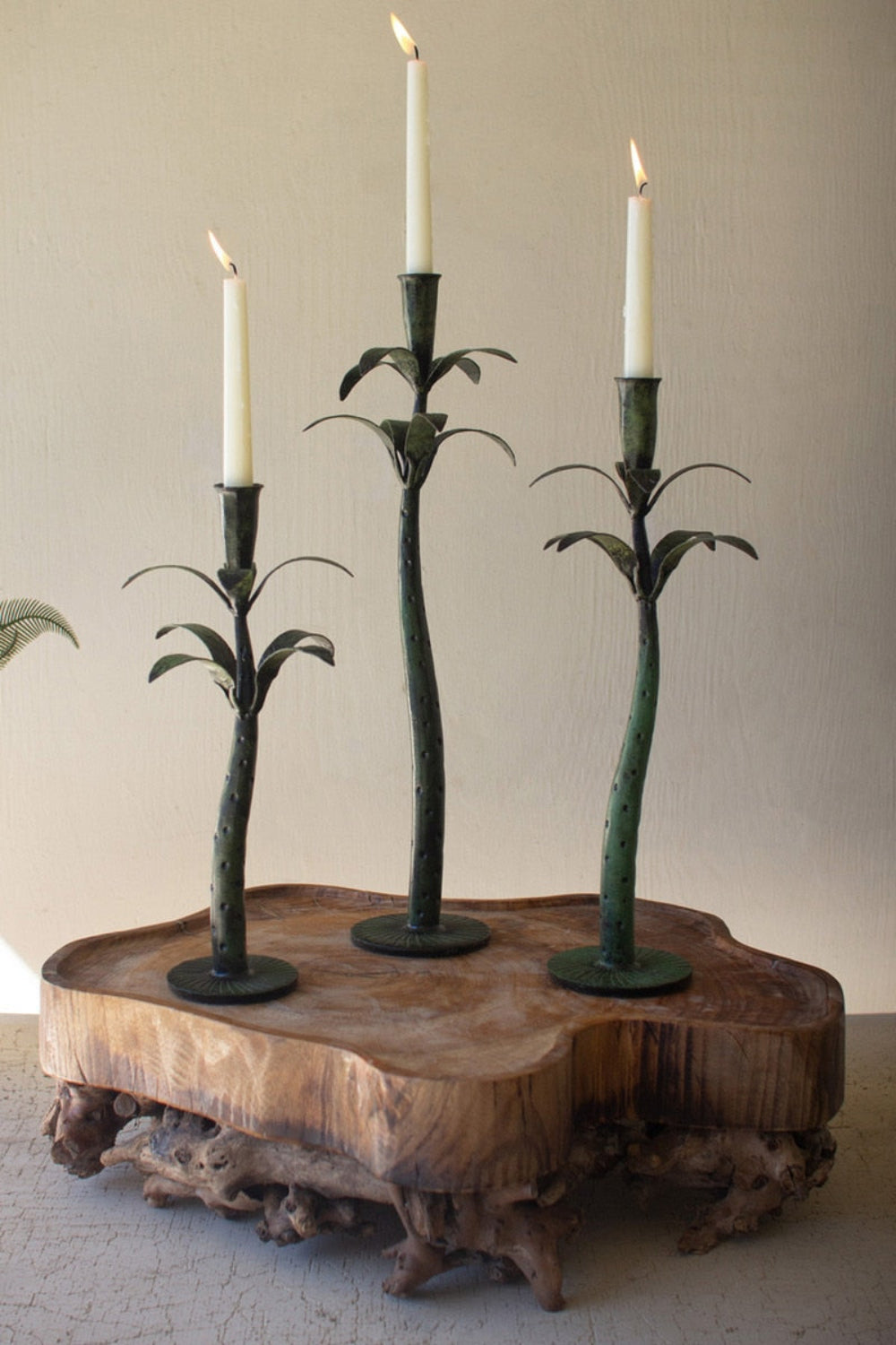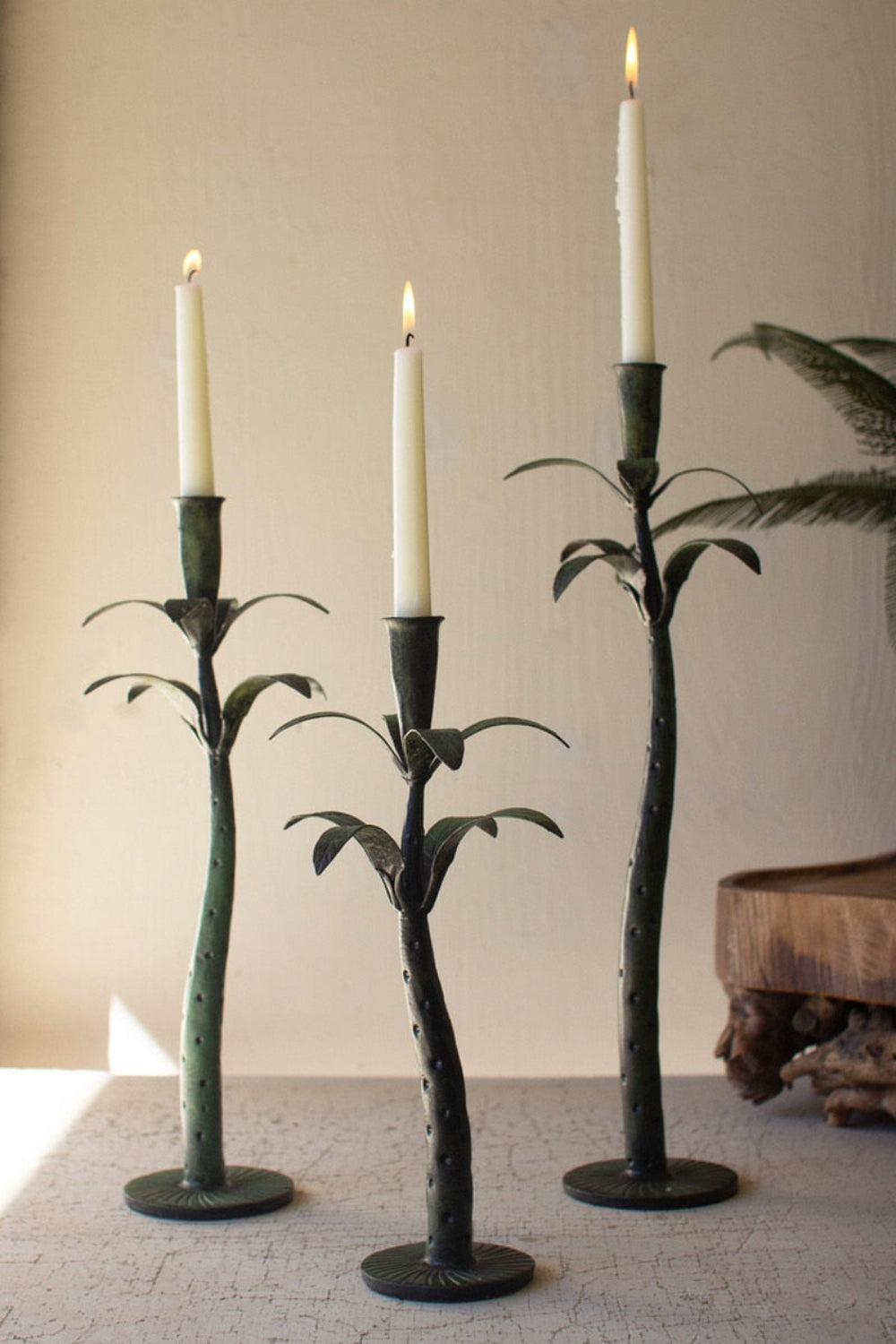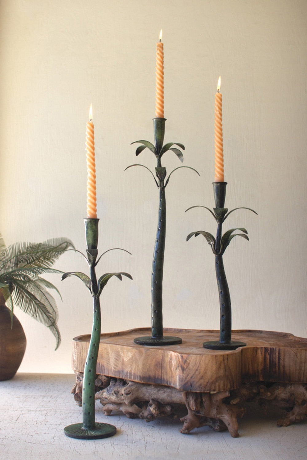 decorative patina candleholders,handcrafted iron taper holders,iron palms candle holders,iron taper candle set,palm-inspired candle holders,patina taper candle holders,rustic home décor accents,rustic iron décor,set of three metal candleholders,tabletop candle stands,tabletop centerpiece candle décor,unique metal taper holders
