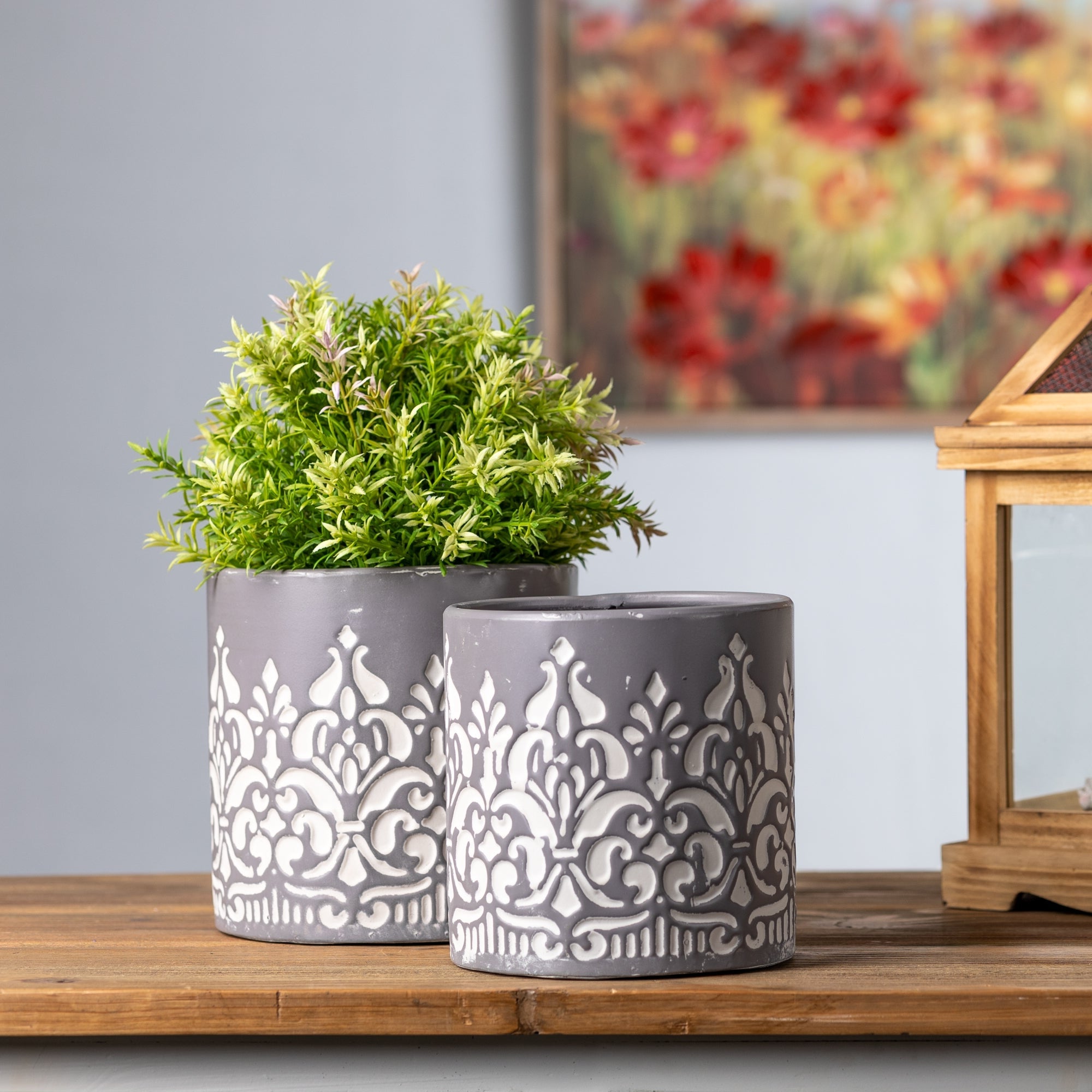 Elevate your plant displays with this set of two ornate metal planters, featuring distressed grey tones with white accents. Crafted from durable iron, these planters are designed to last while adding sophistication and charm to any indoor or covered outdoor space. The set includes one 7.5"H planter and one 6.75"H planter, providing versatile styling options for tabletops, shelves, patios, or entryways. Perfect for displaying potted plants, succulents, or florals, they create a balanced, nature-inspired atmosphere effortlessly. Lightweight yet sturdy, these planters are easy to move and position. Their timeless design complements modern, contemporary, or classic interiors, making them ideal for creating a welcoming and stylish display in your home or patio.