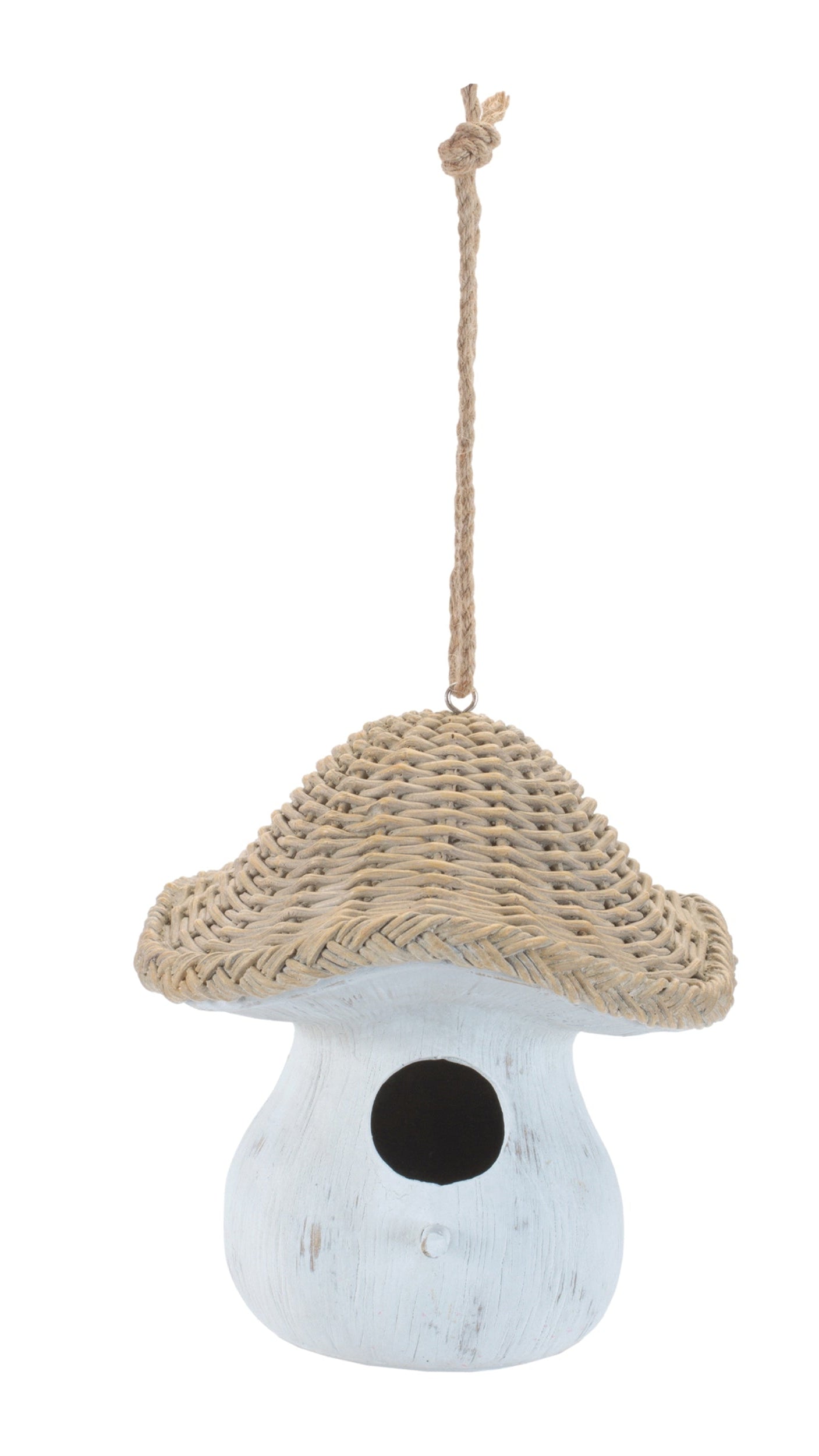 The mushroom birdhouse adds whimsical charm to garden spaces with its playful silhouette and wicker-style detailing. Crafted from durable polyresin with fabric accents, this decorative birdhouse features soft white and beige tones enhanced by a lightly distressed finish. A woven-look top creates visual texture, while the jute rope hanger allows easy placement on shepherd’s hooks, porch hooks, or tree branches. Designed as a decorative garden accent, it complements farmhouse, cottage, and storybook-inspired outdoor settings. Its compact size makes it easy to layer into existing décor without overwhelming the space. Measures 7.25" L x 7" W x 8" H. Intended for outdoor decorative use.