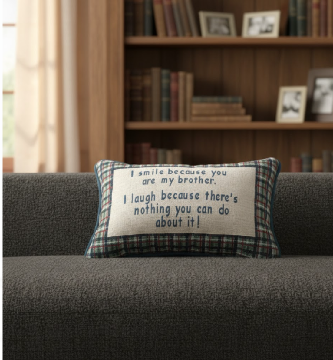 This decorative word pillow features the heartfelt phrase “I Smile Because I Have a Brother” in clear typography. Made from a durable cotton, polyester, and polypropylene blend, this 12.5" x 8.5" pillow adds a warm and personal touch to bedrooms, living rooms, or family spaces. Perfect as a gift or meaningful accent.