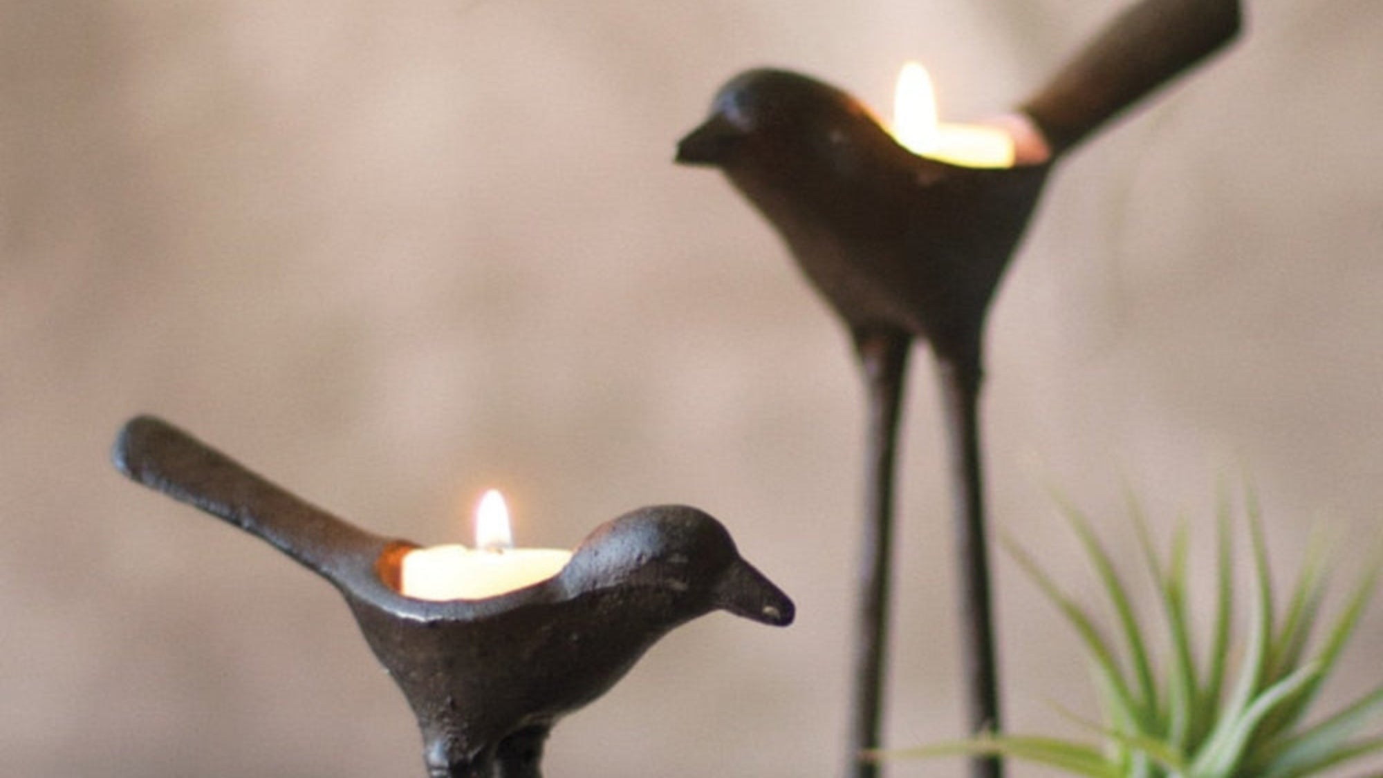 Distressed Brown Cast Iron Bird Tea Light Holders – 2x Set of 2 – 7"Tall by Kalalou