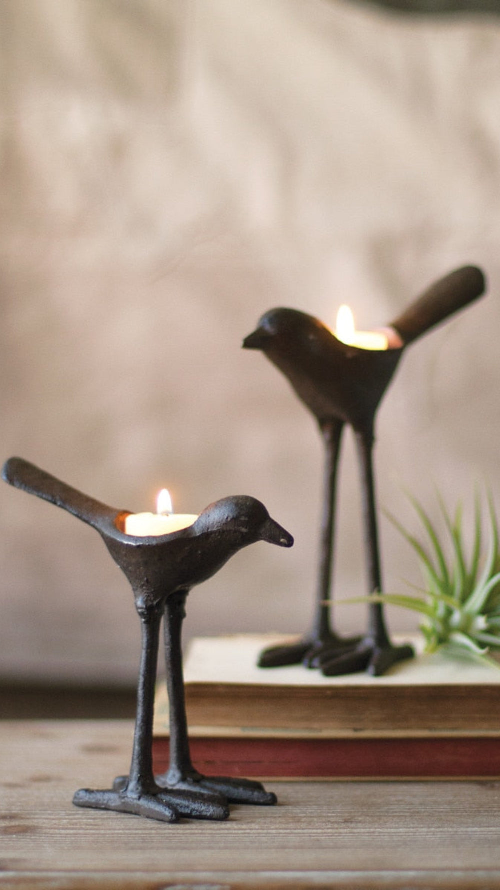 Add rustic charm to your home decor with this set of two cast iron bird tea light holders by Kalalou. Crafted from durable distressed cast iron, each holder features a bird design and comes in two different sizes, measuring approximately 6.5" L x 3" W x 7" H (large) and 2.65" L x 8.5" W x 3.5" H (small), offering versatility for tabletop or shelf display. Ideal for bird lovers or as a thoughtful gift, these holders create a warm ambiance when paired with tea lights. The set is easy to maintain—simply wipe clean with a lint-free, dry cloth—and complements transitional, rustic, or farmhouse decor styles.