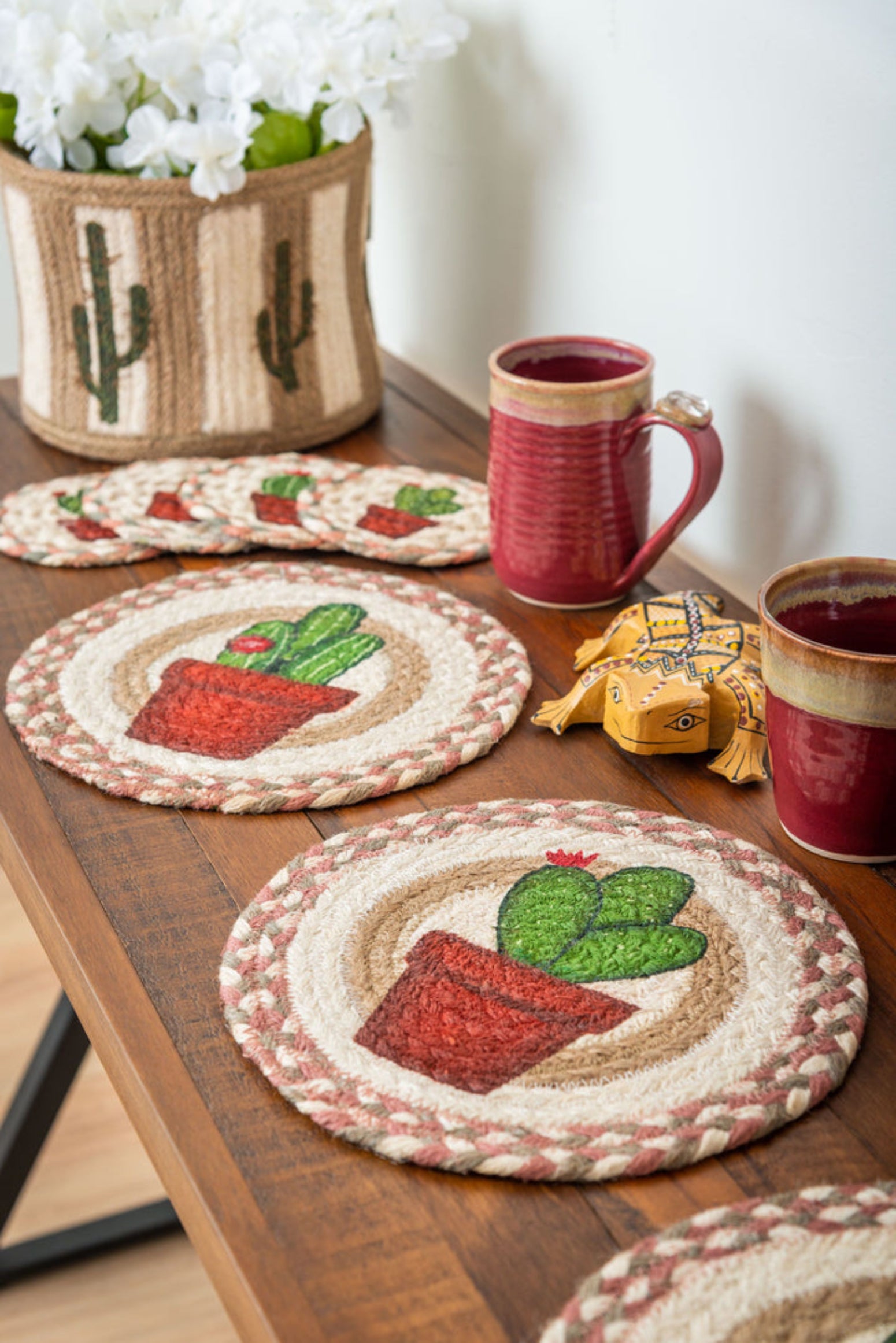 - Color Scheme: Earth-toned natural jute with green cactus stencil