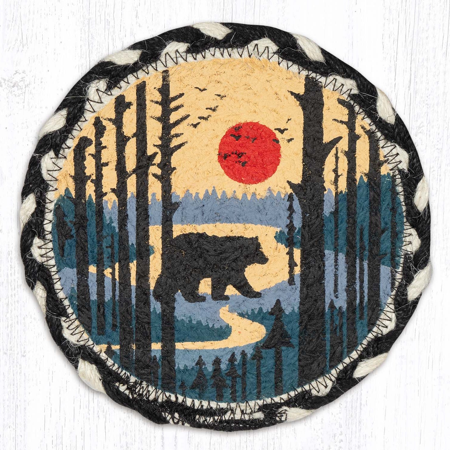 Earth Rugs Bear Scene Round Coaster – 7"x7" Braided Jute with Hand-Stenciled Wildlife & Forest Design for Rustic Cabin Decor