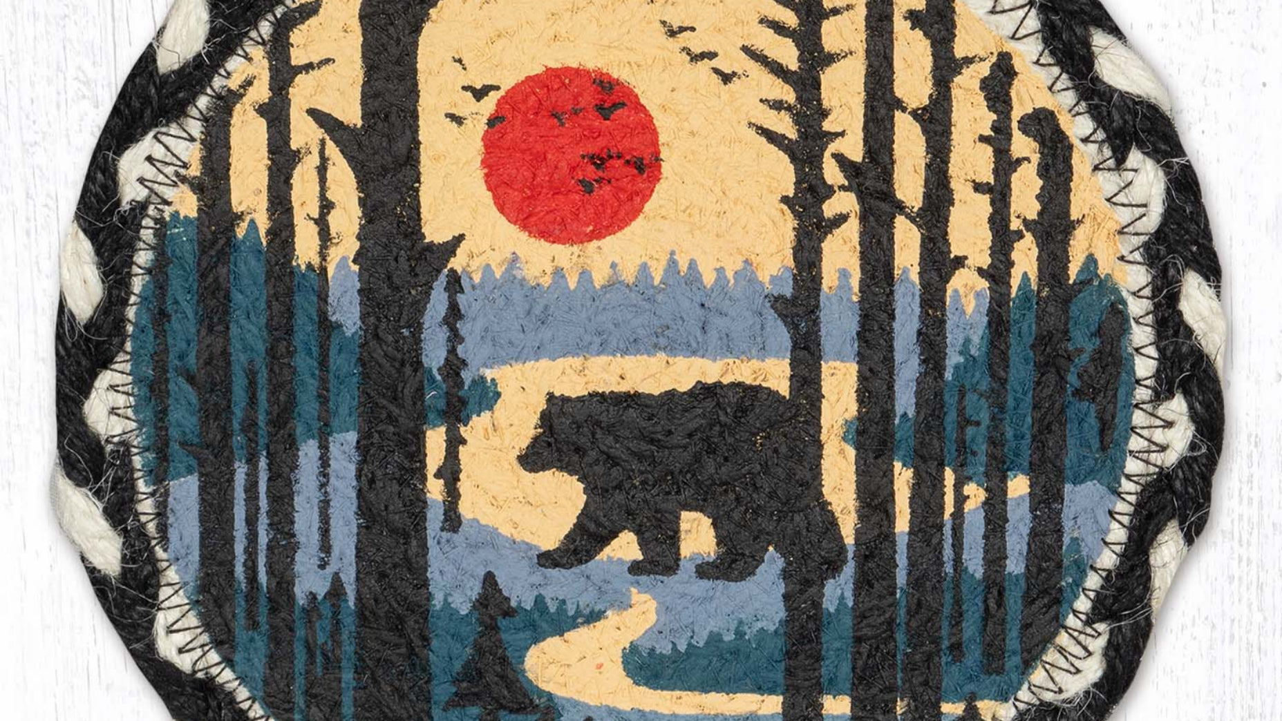 SKU - ER79-430BSBear Scene Round Coaster – 7"x7" Braided Jute with Hand-Stenciled Wildlife & Forest Design for Rustic Cabin Decor