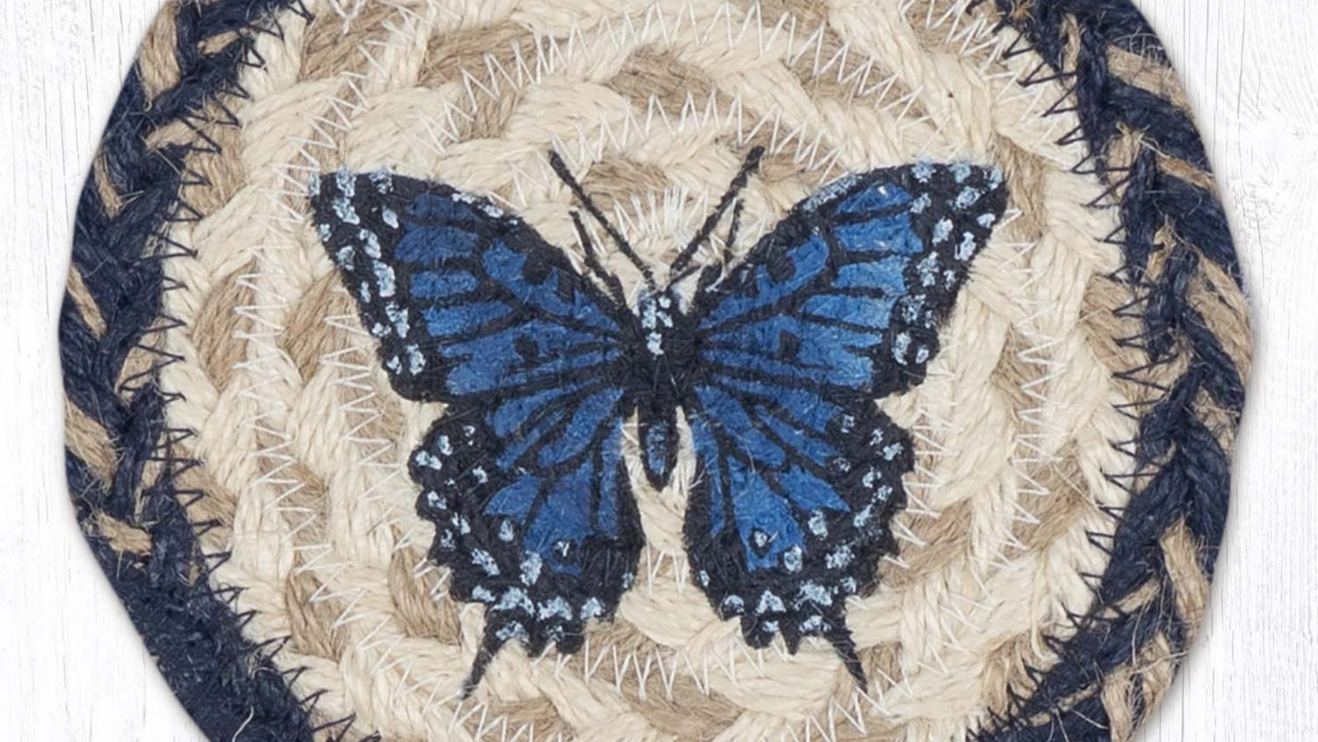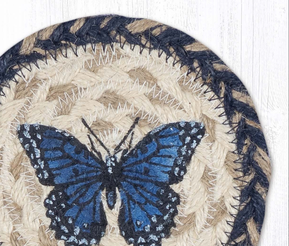 Bring nature indoors with the Earth Rugs Blue Swallowtail Printed Jute Coaster, featuring a stunning illustration of a blue swallowtail butterfly in flight. This 5" round braided jute coaster adds a delicate touch of natural beauty while protecting your surfaces from heat, moisture, and scratches. The bold blue hues pop against the neutral jute background, making it a perfect accent for rustic, farmhouse, or garden-inspired spaces. Durable and handcrafted from sustainable materials, this coaster is equal parts functional and decorative.