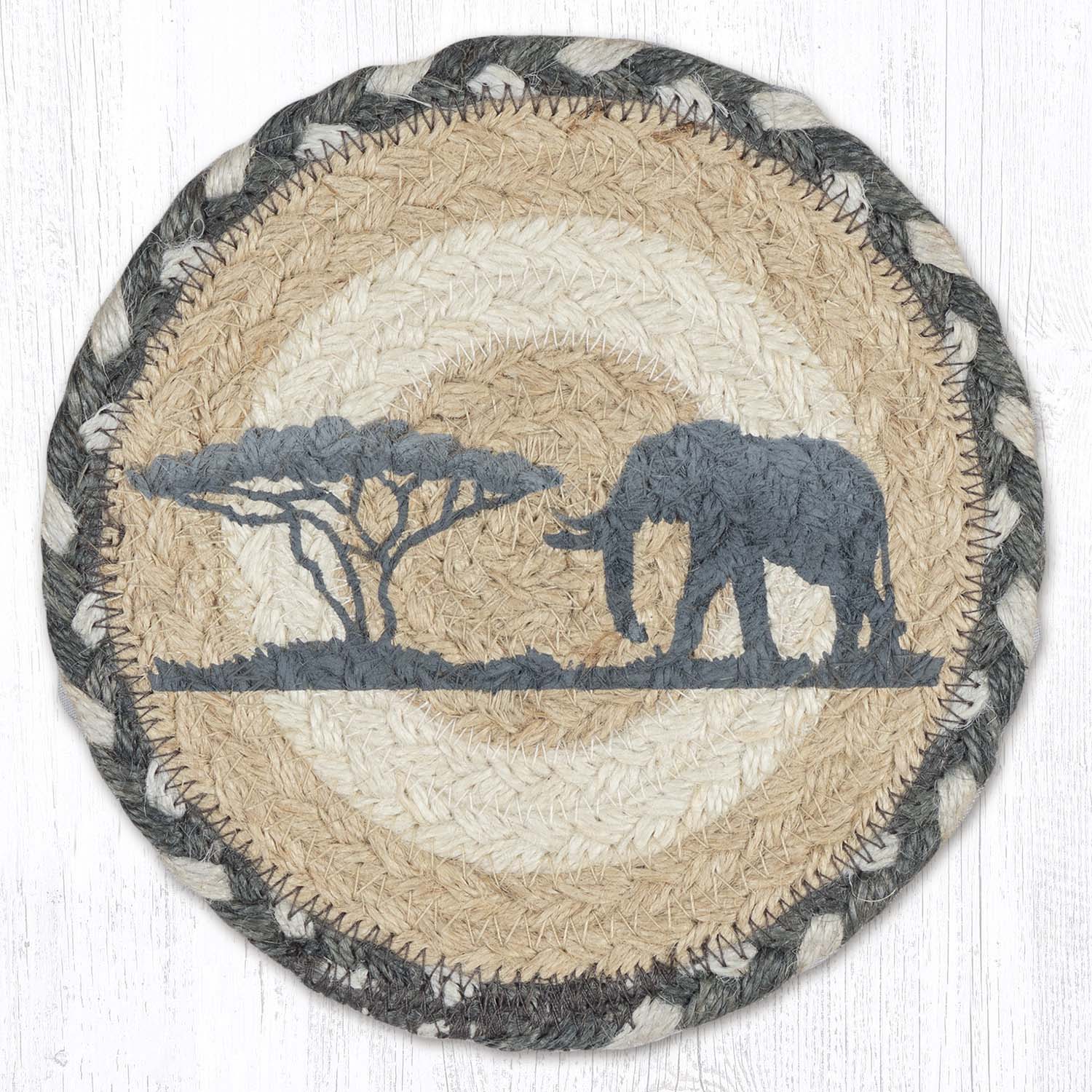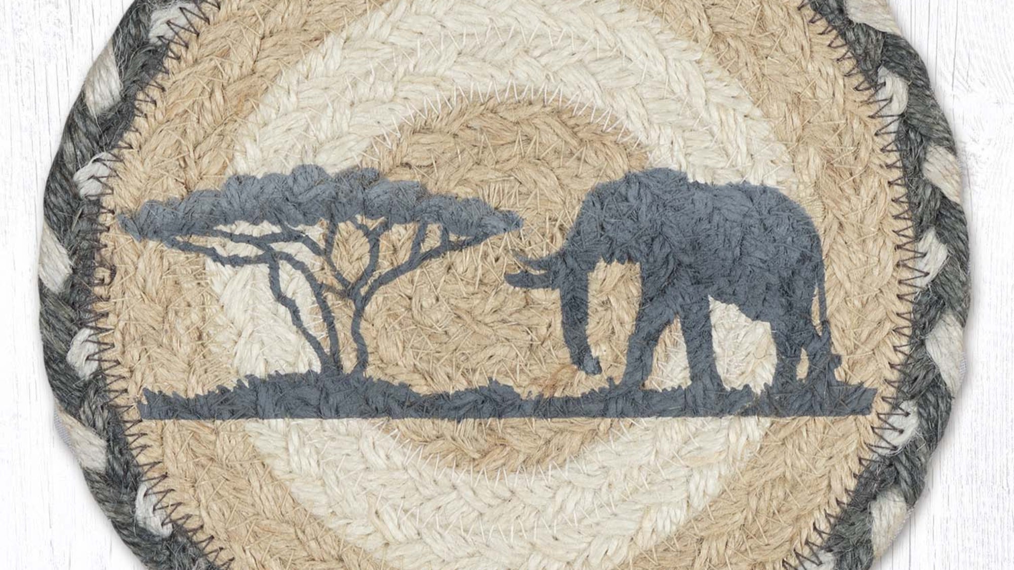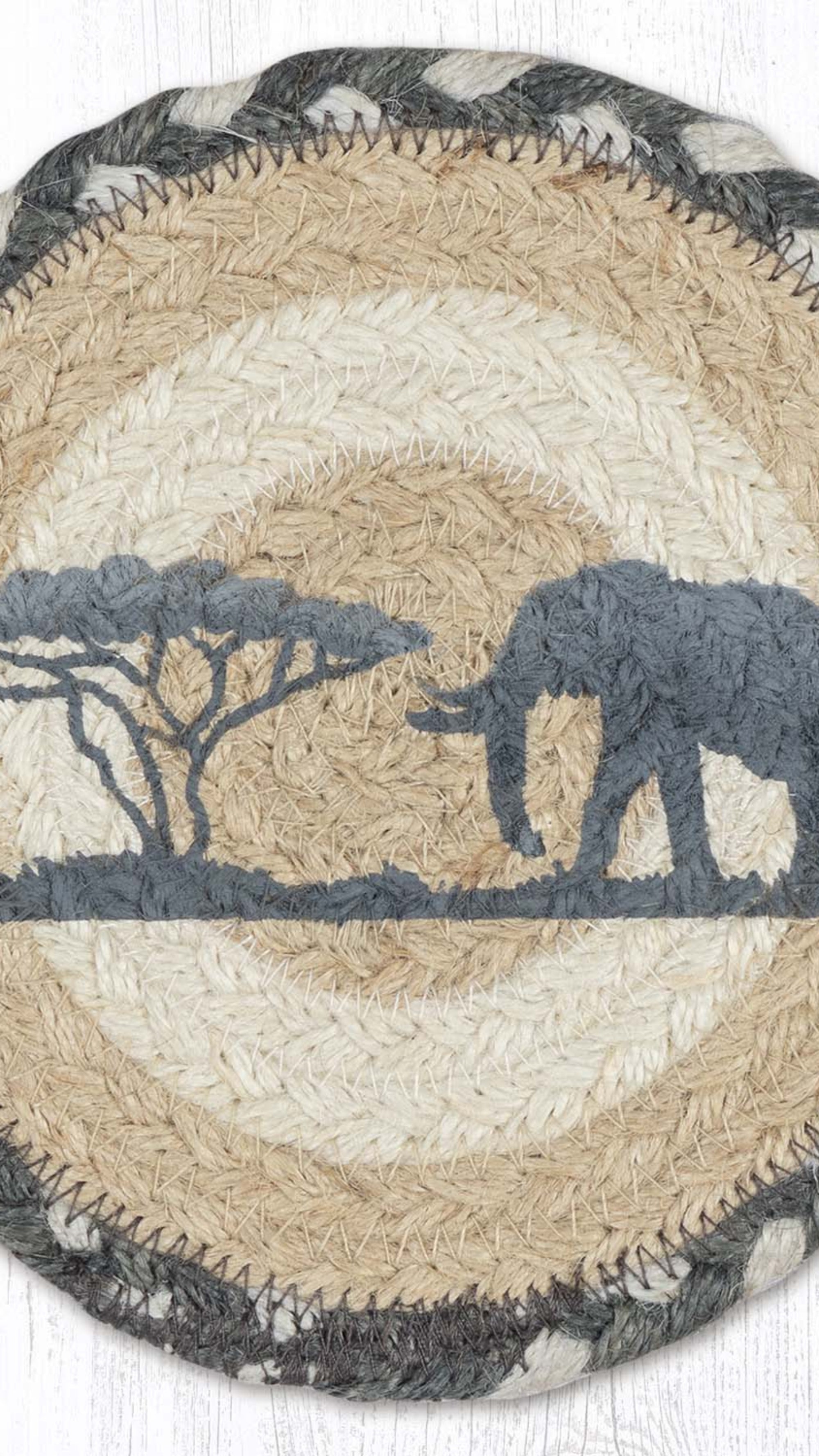 braided jute elephant mat,country farmhouse coaster,Earth Rugs elephant coaster,eco-friendly round coaster,elephant coaster,elephant design table mat,farmhouse wildlife coaster,Kitchen Accessories,large round drink coaster,rustic animal motif coaster,rustic elephant round coaster,rustic wildlife accent,wildlife table décor
