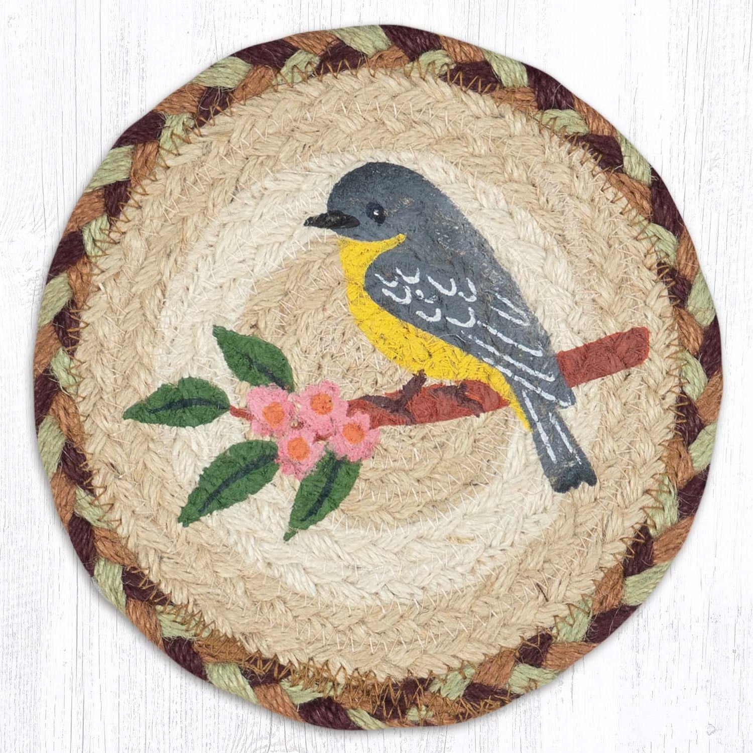 Brighten your tabletop with the delicate charm of the Earth Rugs Finch with Flowers Round Large Coaster, featuring a sweet yellow finch perched among vibrant blooms. Crafted from hand-braided natural jute, this 7-inch round coaster blends rustic texture with colorful botanical beauty. The finely detailed bird and floral motif adds a peaceful, garden-inspired accent to your space—ideal for spring-themed decor, cottage kitchens, sunrooms, or nature-loving households. Durable and eco-friendly, it serves both as a decorative piece and a functional protector for your furniture.