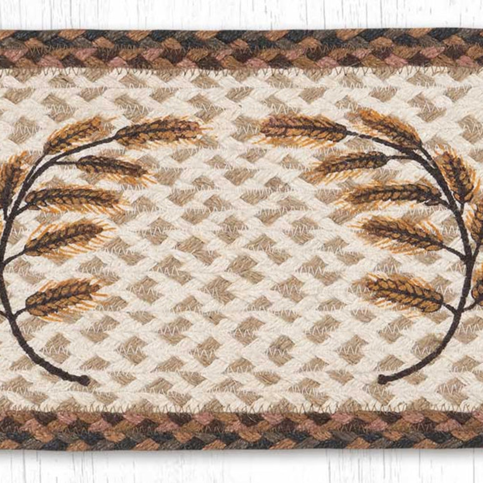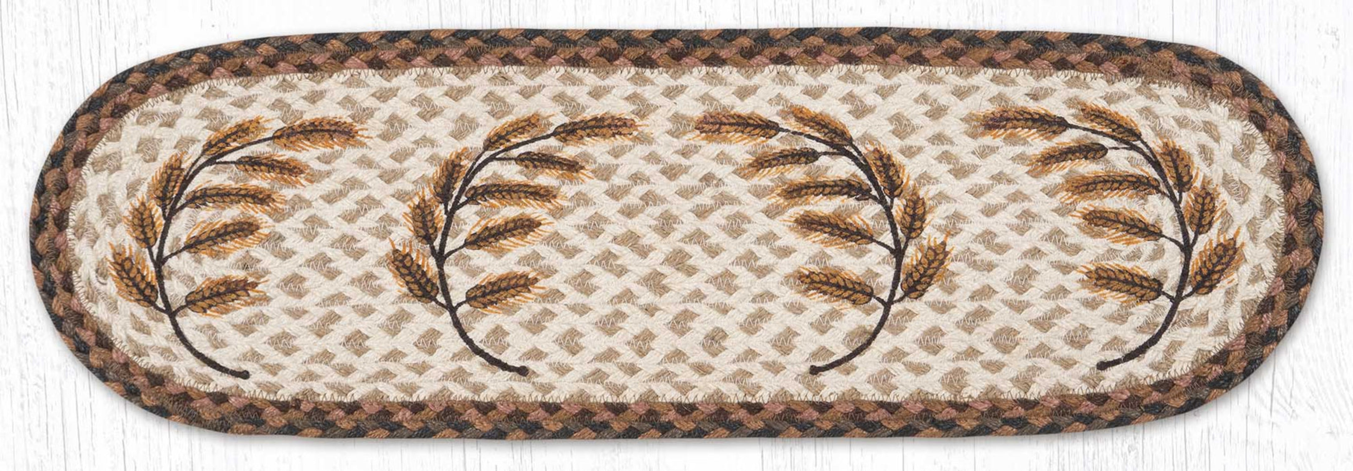 Celebrate the beauty of the harvest season with the Susan Burd Golden Wheat Stair Tread, featuring a warm, hand-stenciled design on 100% braided natural jute. Measuring 27 inches in length and 8.25 inches in width, this oval rug showcases golden wheat stalks gently bending in the breeze, evoking feelings of abundance, peace, and rustic charm. The natural jute fibers offer earthy texture, making it ideal for farmhouse, fall, and country-style décor. Whether placed on stairs, along shelves, or under seasonal centerpieces, its flexible design and handcrafted artistry add organic elegance to any space.