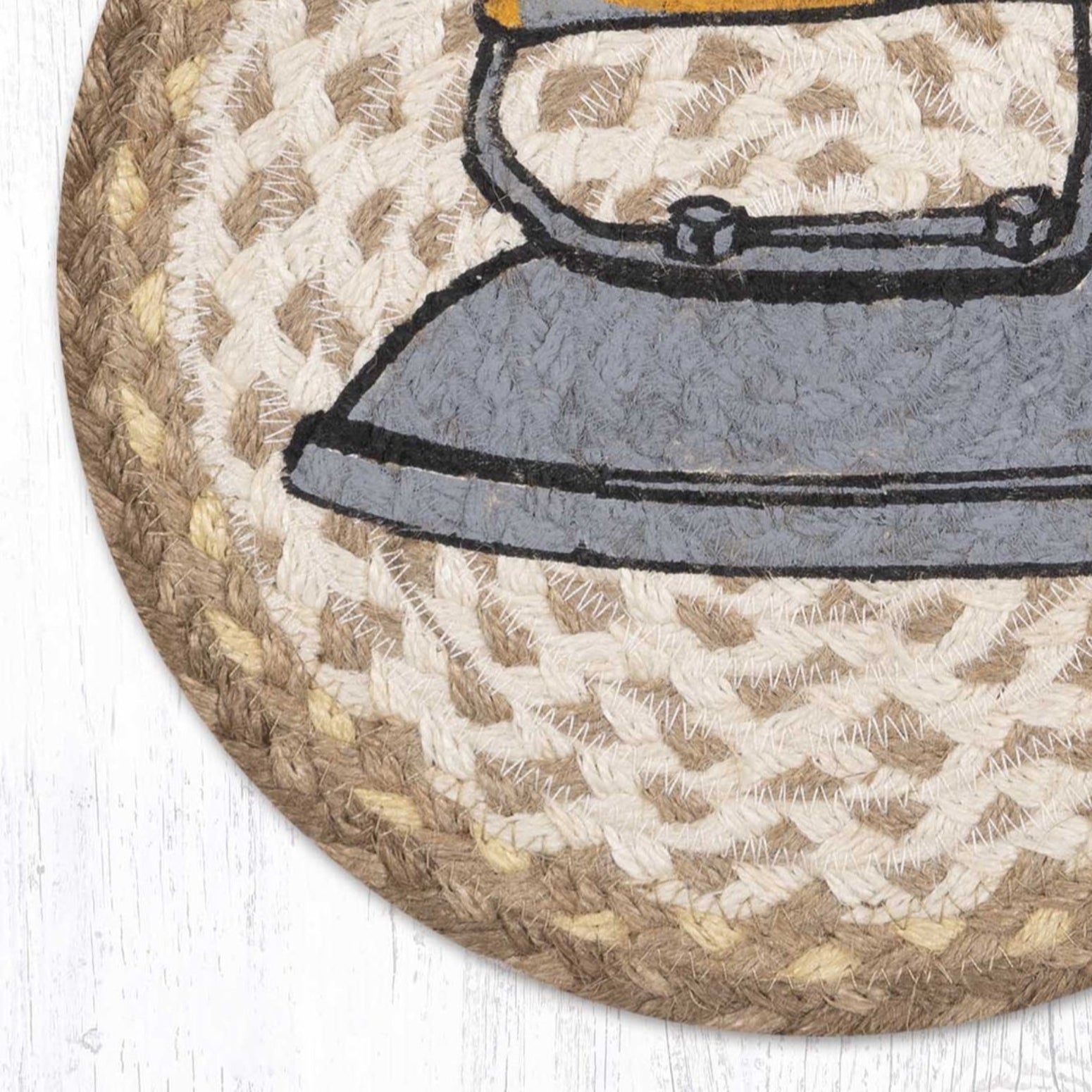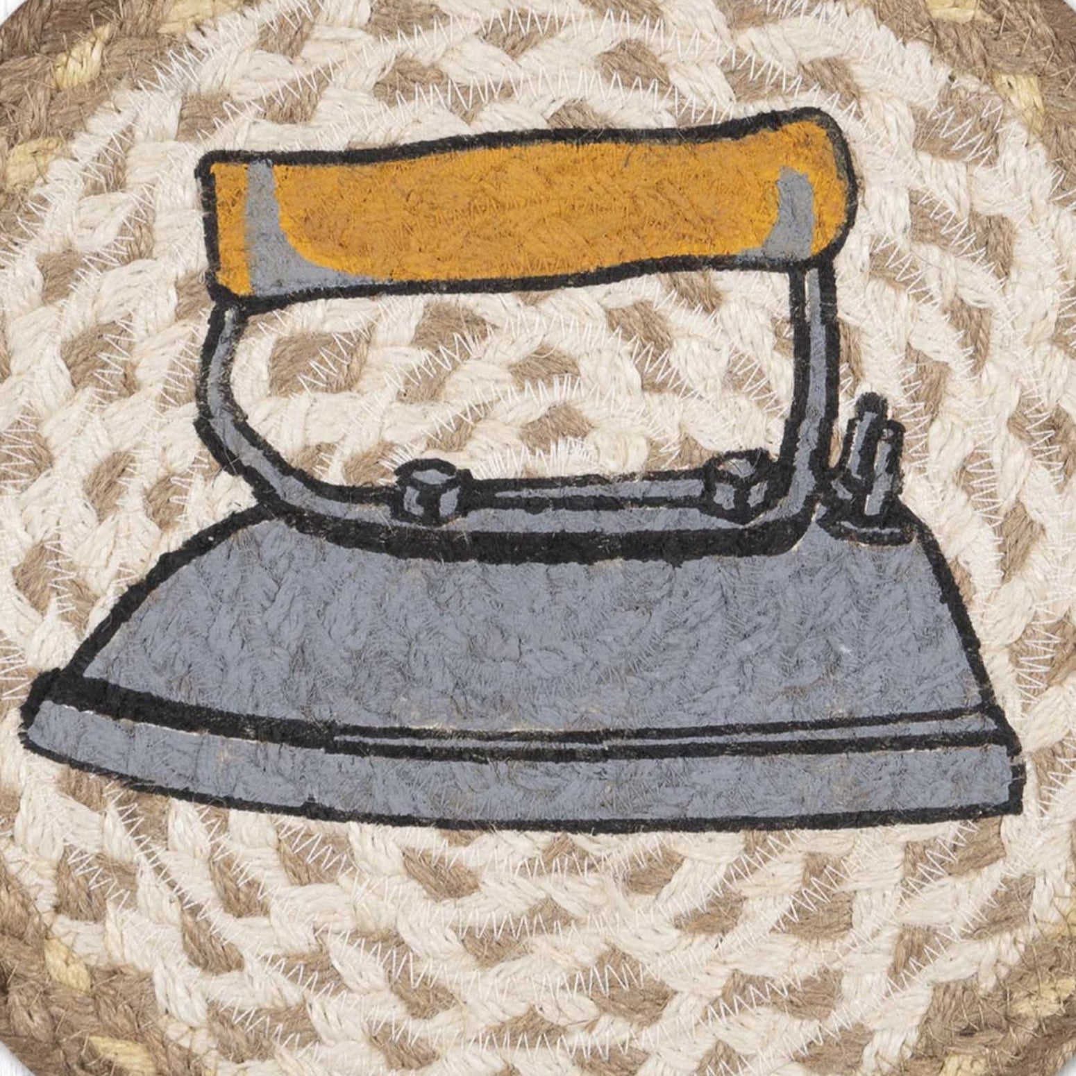 Neutral Laundry Decor – Round Jute Trivet with Vintage Graphic Print