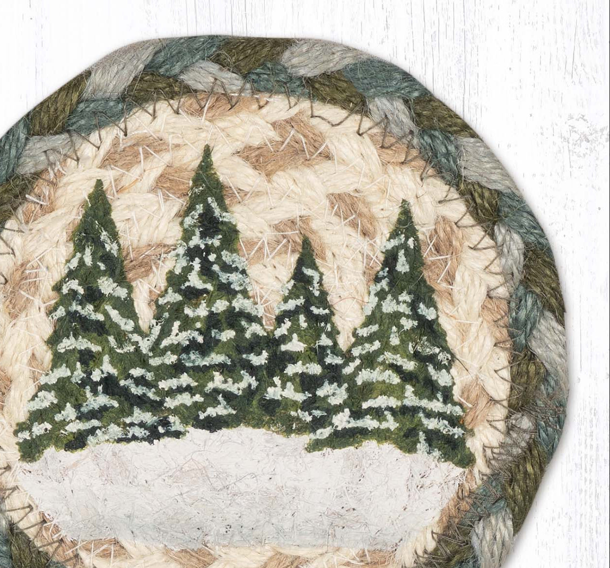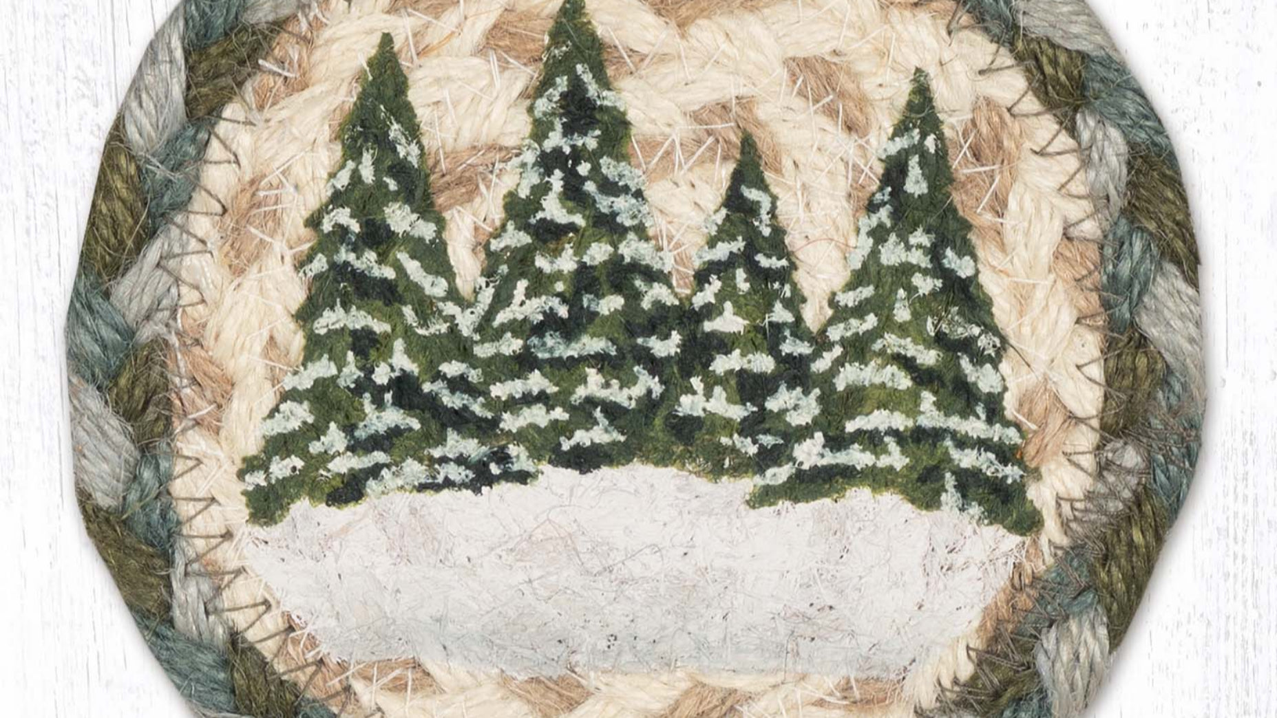 Earth Rugs Holiday Village Trees Printed Coaster – 5"x5" Braided Jute, Festive Winter Decor Accent