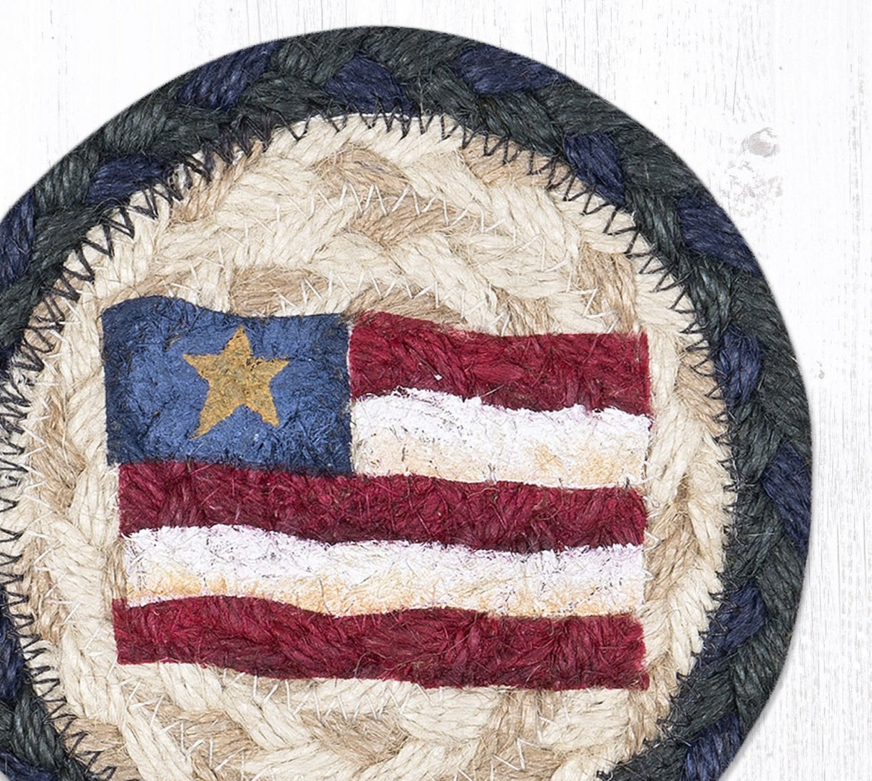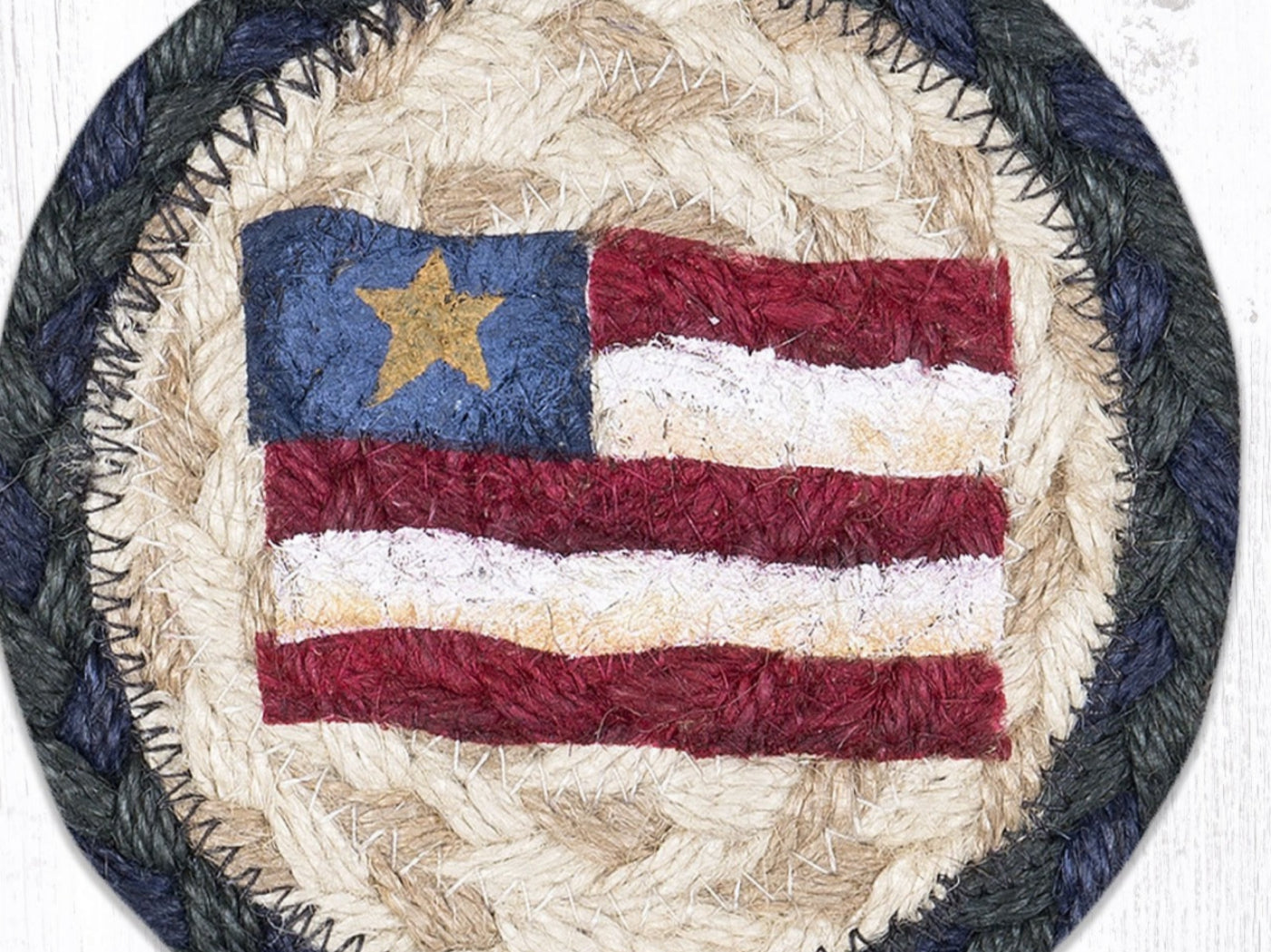 5 inch braided coaster,Americana jute coaster,country flag coaster,Earth Rugs,Earth Rugs star flag coaster,farmhouse patriotic decor,Independence Day table mat,Kitchenware,patriotic drink mat,primitive Americana coaster,primitive flag coaster,printed jute drink coaster,rustic table decor,rustic U.S. flag coaster,Uber Living