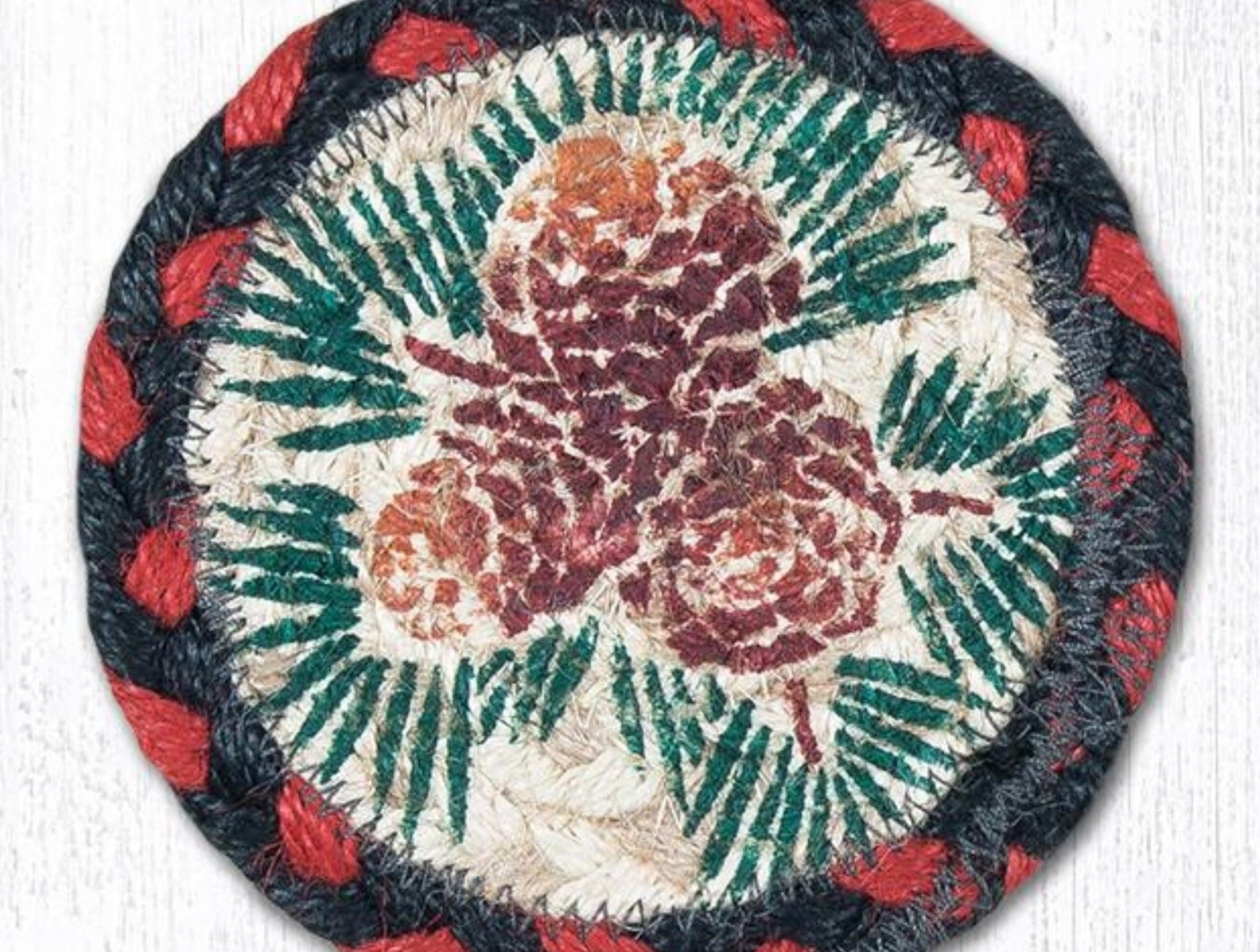Bring a touch of nature indoors with the Earth Rugs Pinecone Printed Coaster, crafted from 100% natural braided jute. Featuring a warm, woodland-inspired pinecone print, each 5"x5" coaster adds a cozy rustic charm to your living room, dining table, or cabin retreat. The durable and eco-friendly jute fibers are both functional and decorative, absorbing moisture while protecting surfaces from heat and stains. Designed with versatility in mind, these coasters fit seamlessly into farmhouse, lodge, and woodland-style interiors. Their compact square size makes them ideal for mugs, glasses, or small bowls while effortlessly enhancing your table setting.