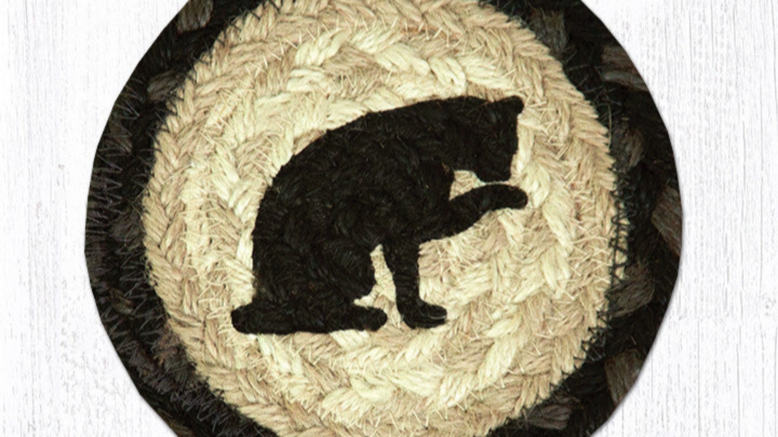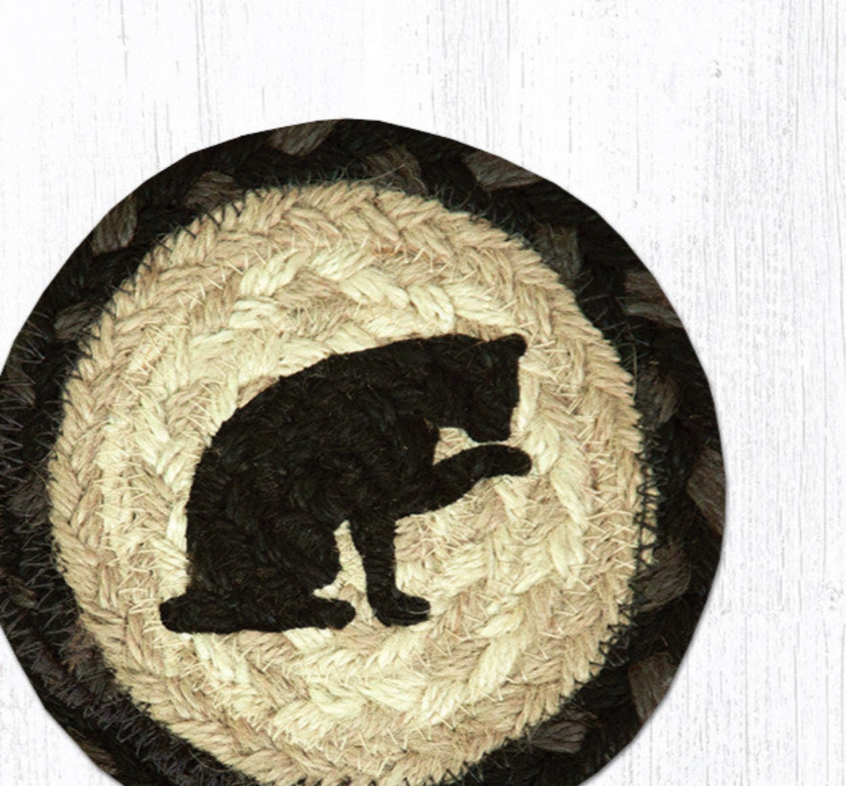 Earth Rugs Cat Coaster – 5"x5" Braided Natural Fiber Drink Mat with Whimsical Black Cat Print for Cozy Home Decor