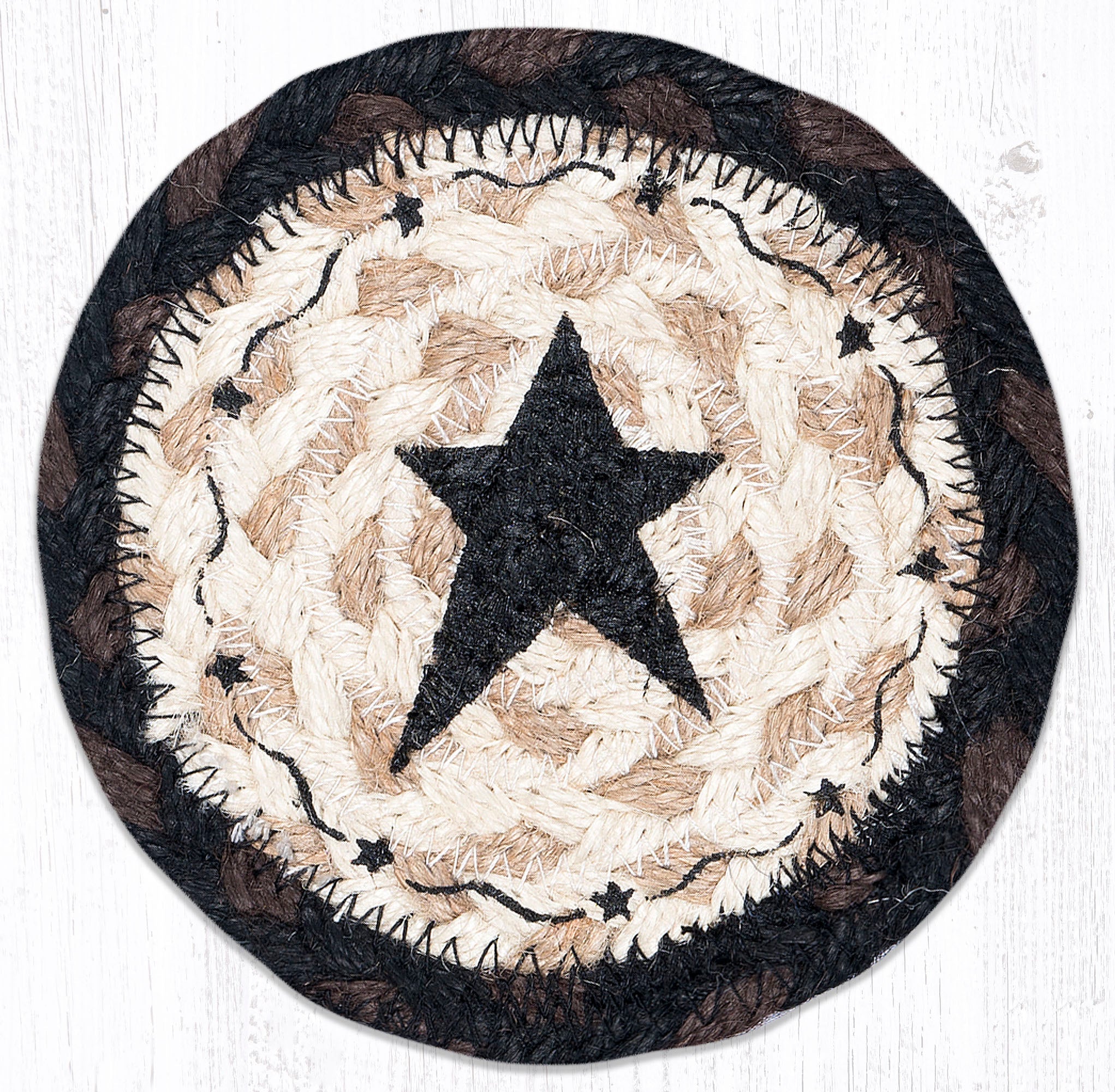 Earth Rugs Primitive Star Black Coaster – 5"x5" Round Braided Natural Jute – Hand-Stenciled Rustic Farmhouse Accent