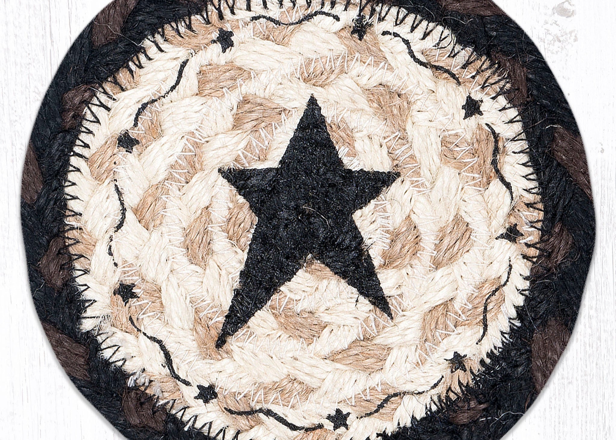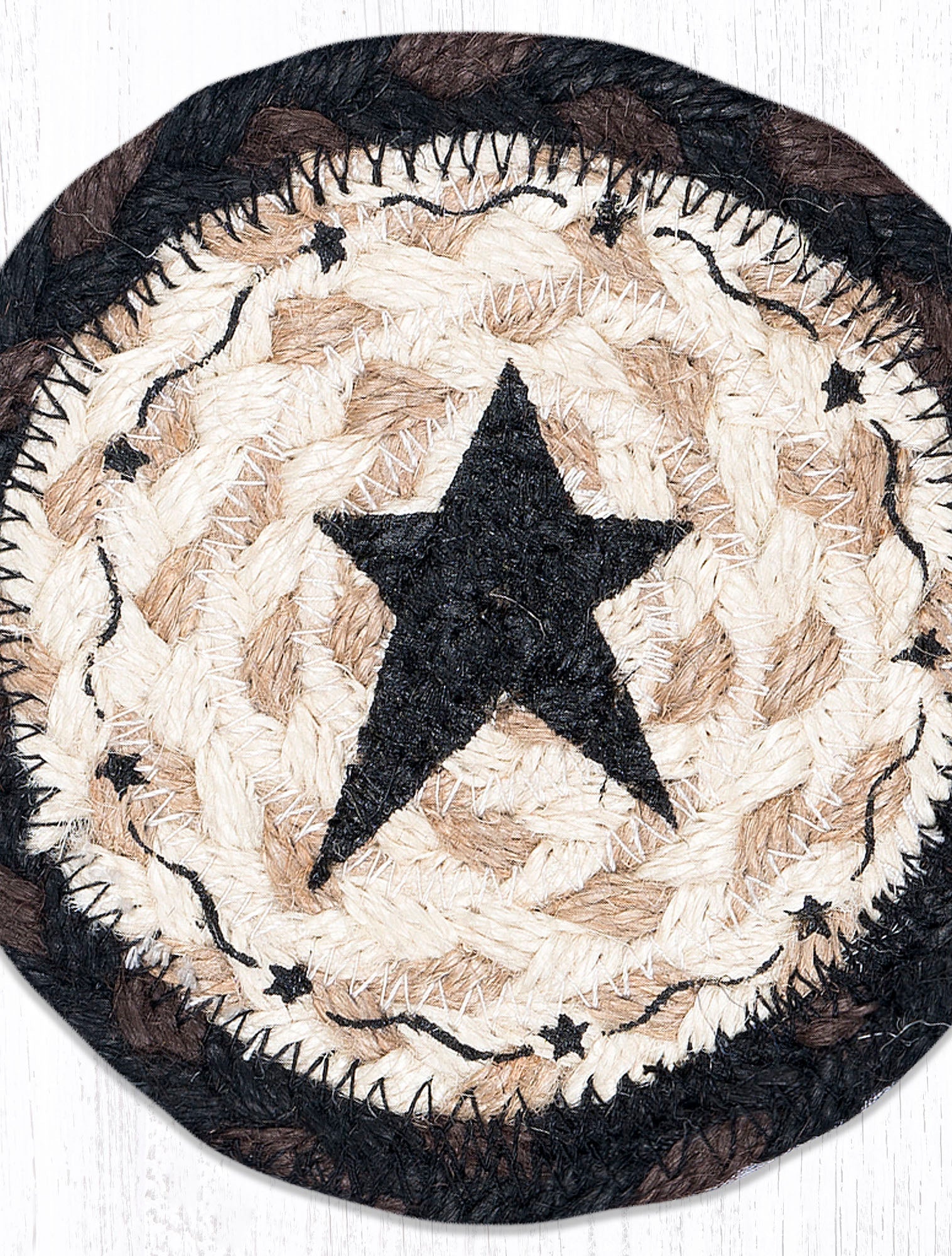 Primitive Star Black Coaster – 5"x5" Round Braided Natural Jute – Hand-Stenciled Rustic Farmhouse Accent