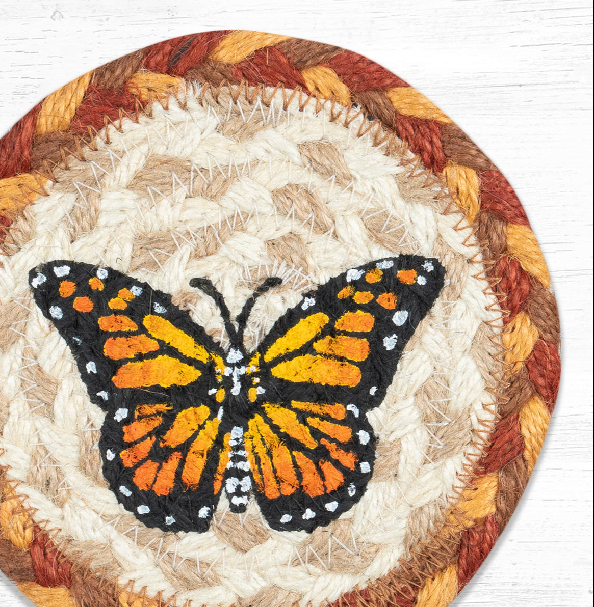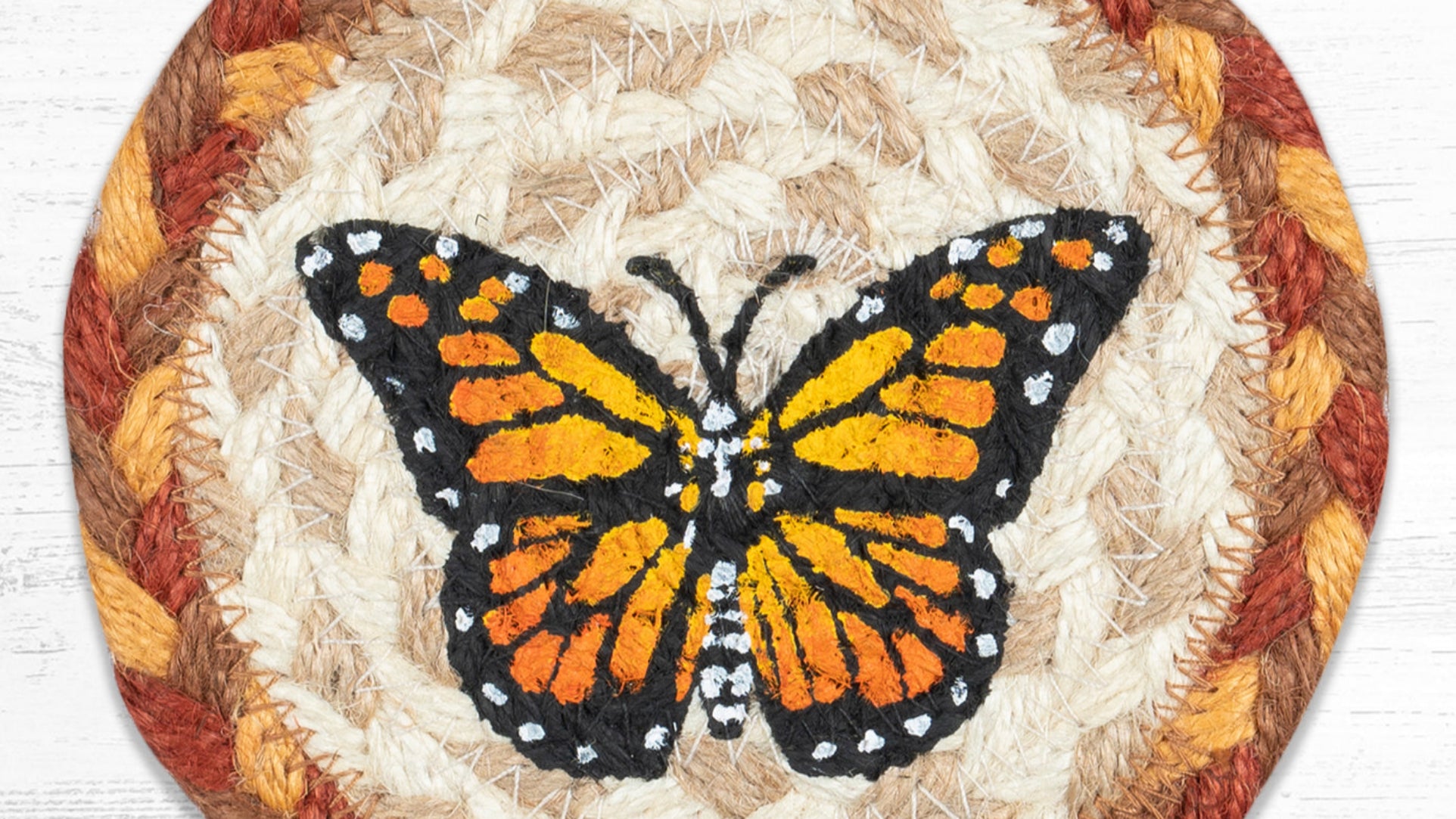 Earth Rugs Monarch Butterfly Coaster – 5"x5" Braided Jute with Hand-Printed Monarch Design for Nature, Garden, or Rustic Decor