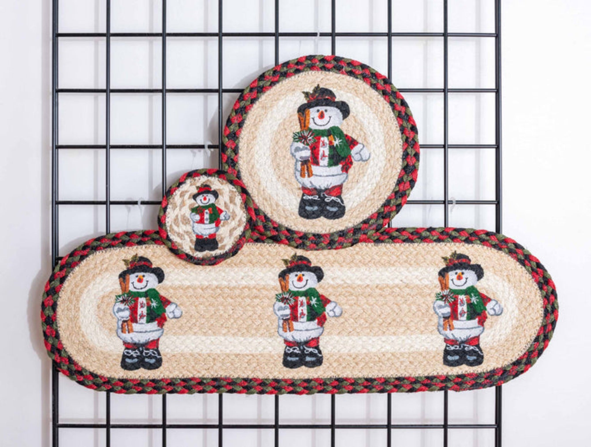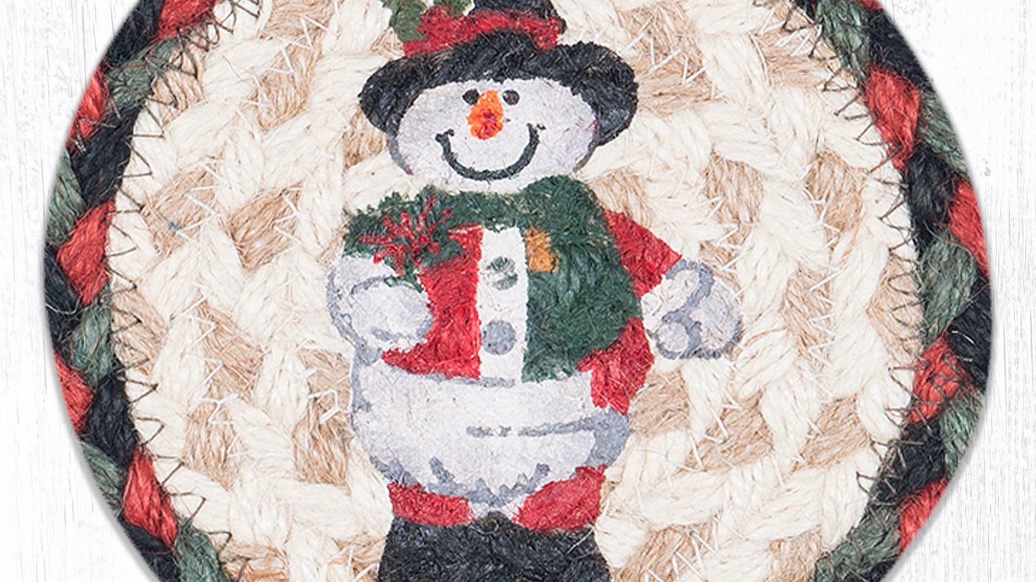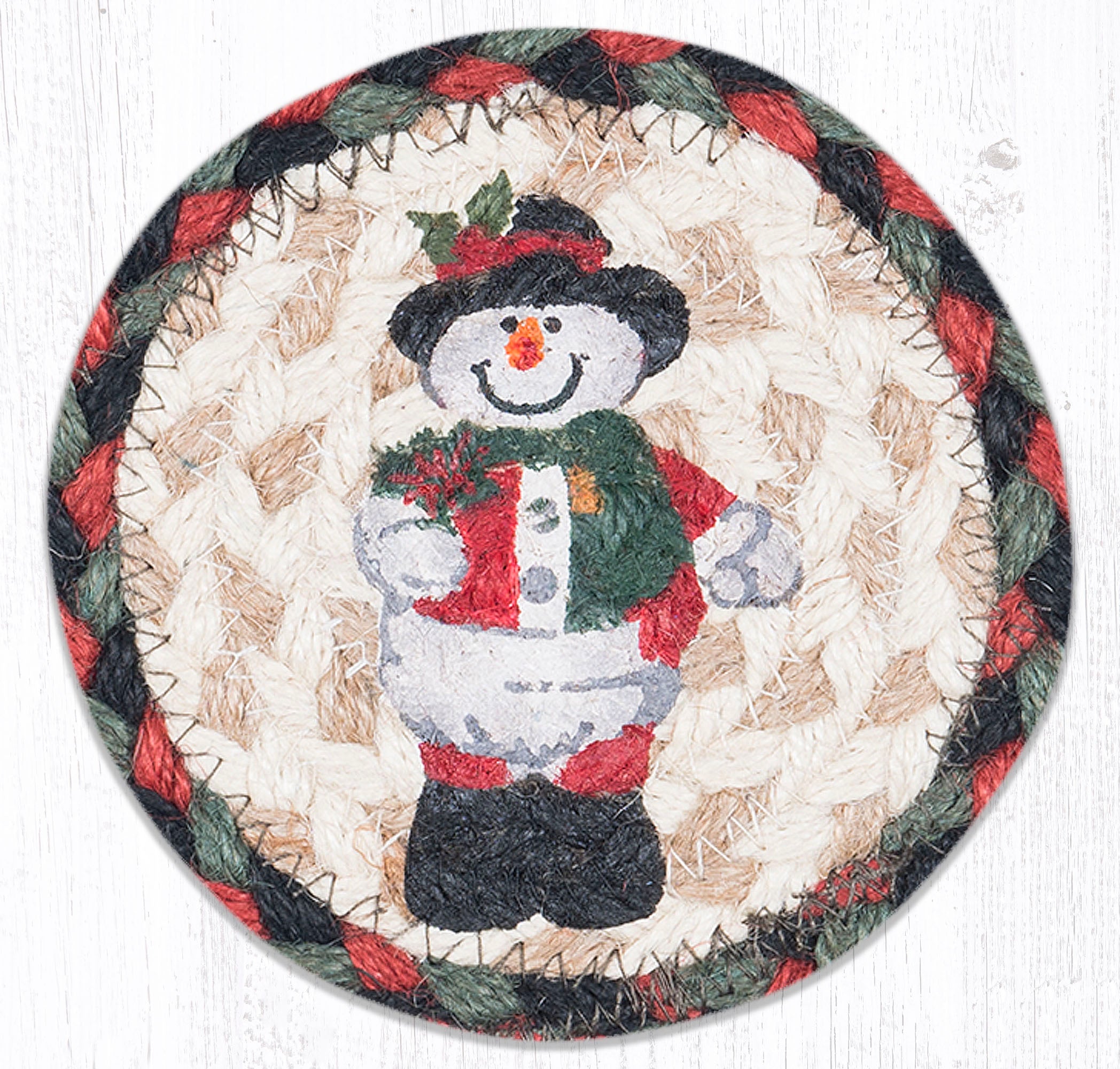 5 inch round coaster,5" printed coaster,compact round coaster,Earth Rugs,Earth Rugs printed coaster,eco-friendly printed coaster,festive farmhouse table coaster,handmade snowman coaster,holiday drink coaster,Kitchenware,rustic farmhouse décor,snowman in top hat printed coaster,table protector coaster,Uber Living,Under $100,winter kitchen tableware